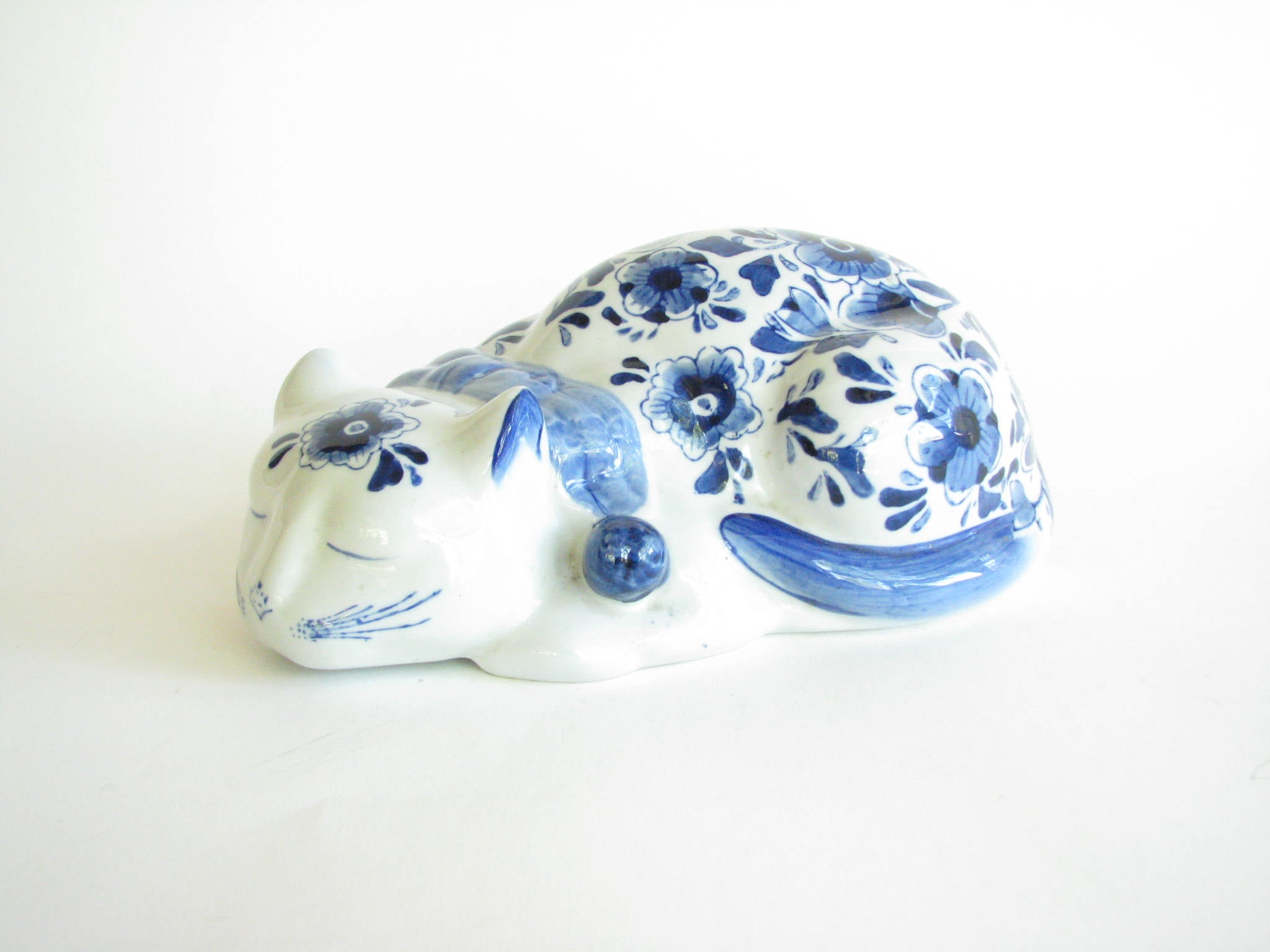 Vintage porcelain resting cat with blue and white design by Andrea by Sadek.