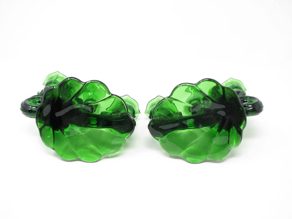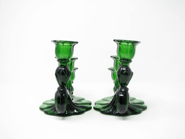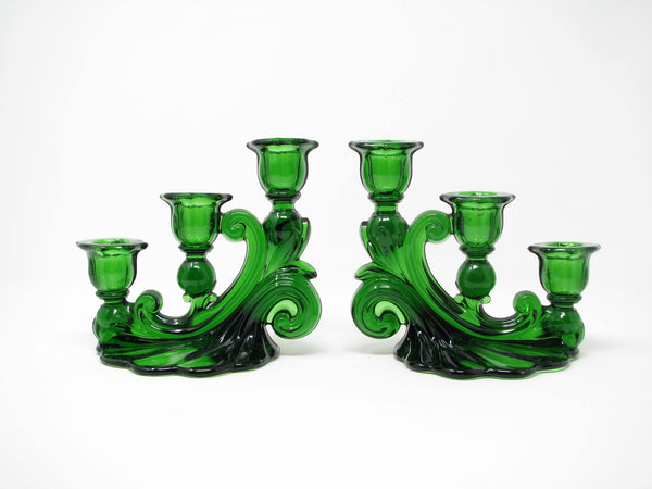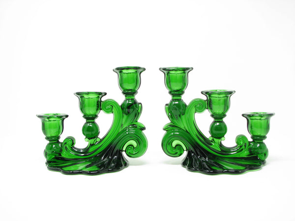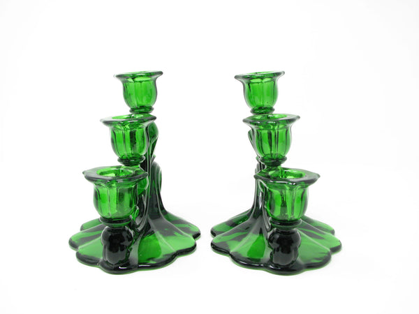 Vintage pair of Cambridge Glass Company Caprice three-light pressed glass candle holders or candelabras in Emerald Green.