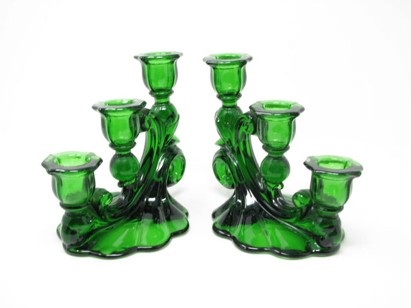 Vintage Cambridge Glass Caprice Emerald Green Three Light Candle Holders / Candelabras - a Pair