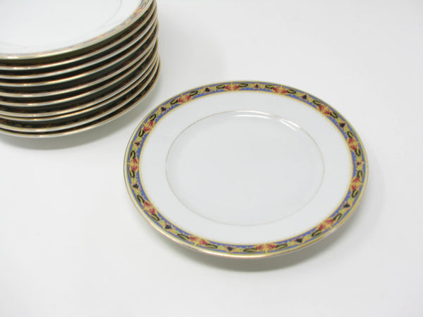 Vintage 1920s-1930s Carl Tielsch & Co porcelain salad plates with multi-color decorative band and gold rim. Made at the Altwasser factory in the Silesia region of Germany. Set includes 11 plates.