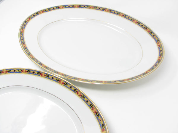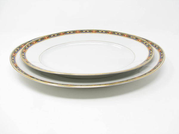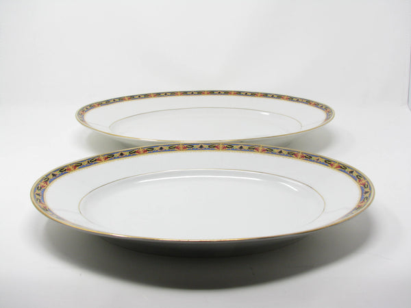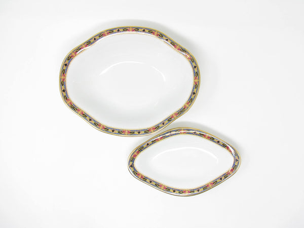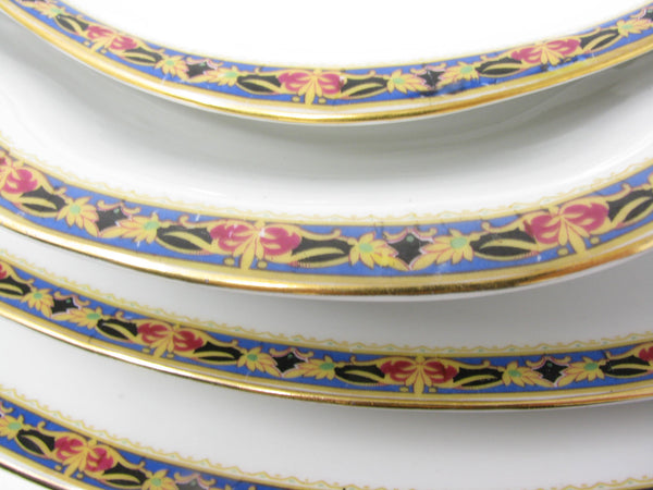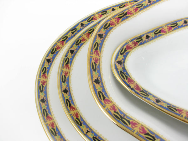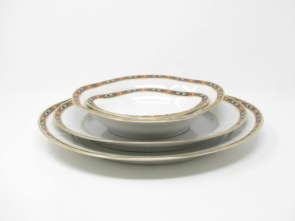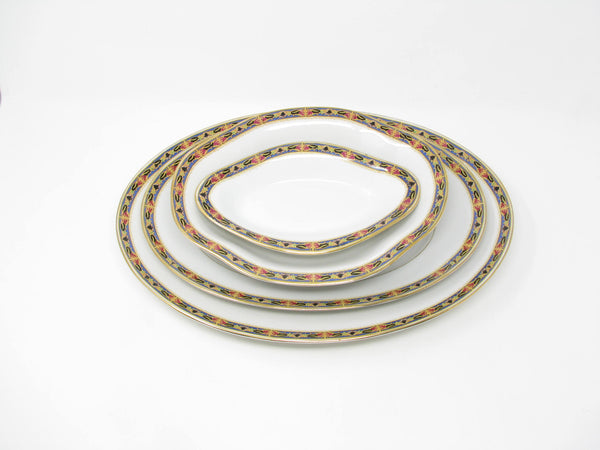 Vintage 1920s-1930s Carl Tielsch & Co porcelain serving dishes with multi-color decorative band and gold rim. Made at the Altwasser factory in the Silesia region of Germany. This 4 piece set includes 2 platters, 1 serving bowl and 1 relish dish.