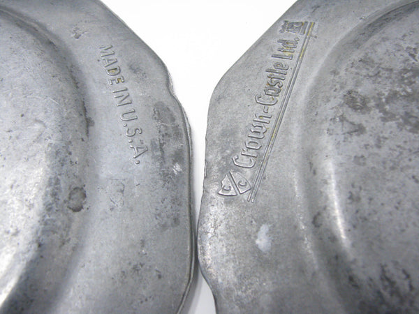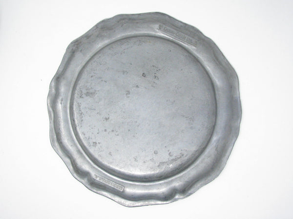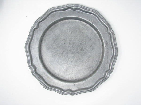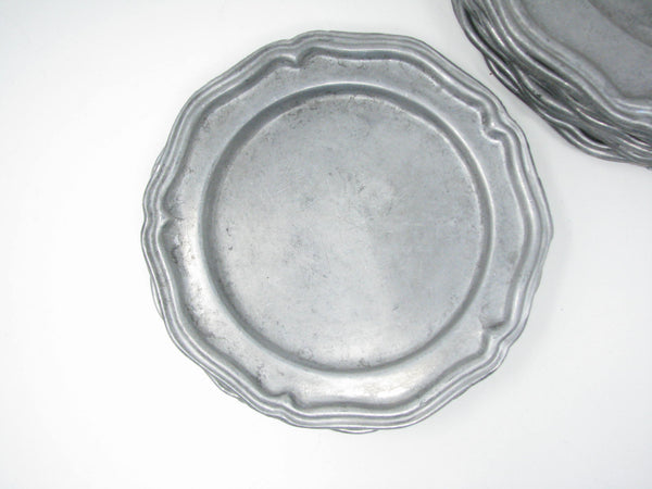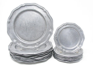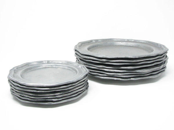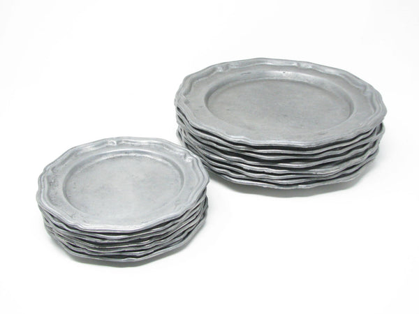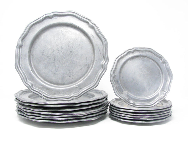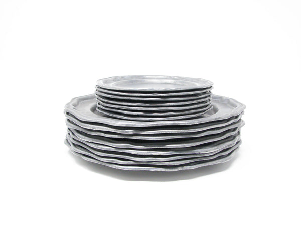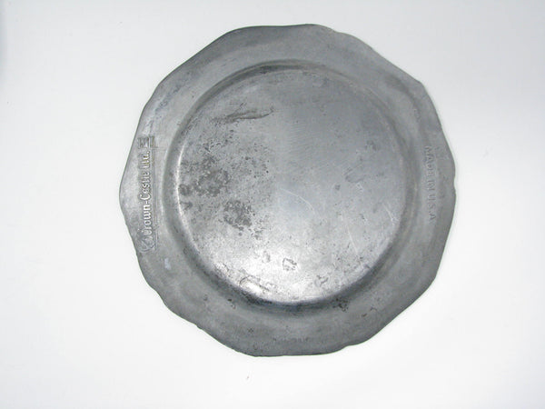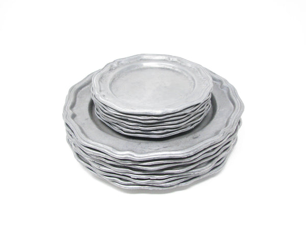 Vintage Crown Castle Ltd plate / charger dinnerware set of hollowware alloy metal with scalloped edge. Made in the United States in the 1970s. Set includes 8 dinner plates and 8 smaller plates.