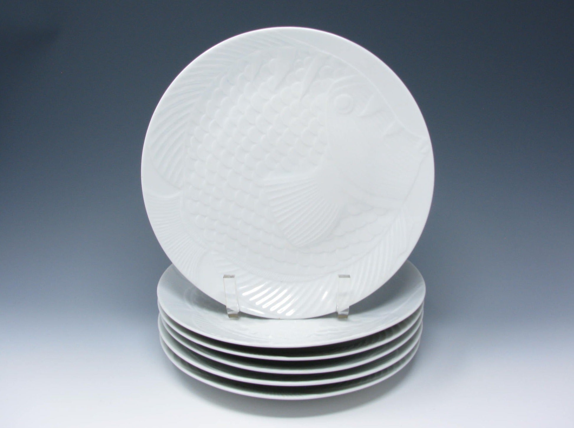 Vintage set of 6 Dansk International Designs porcelain luncheon or dinner plates with embossed fish designs. Made in France.
