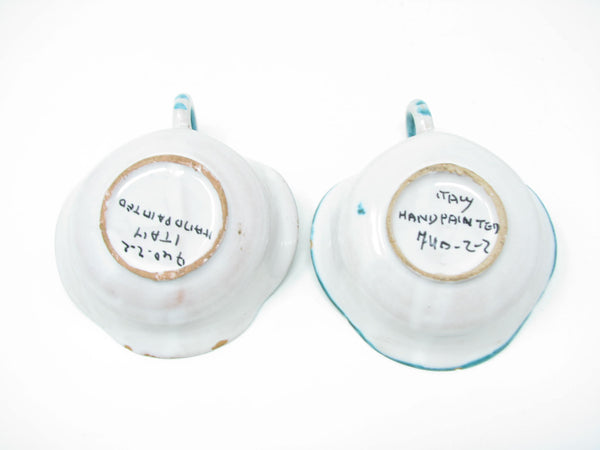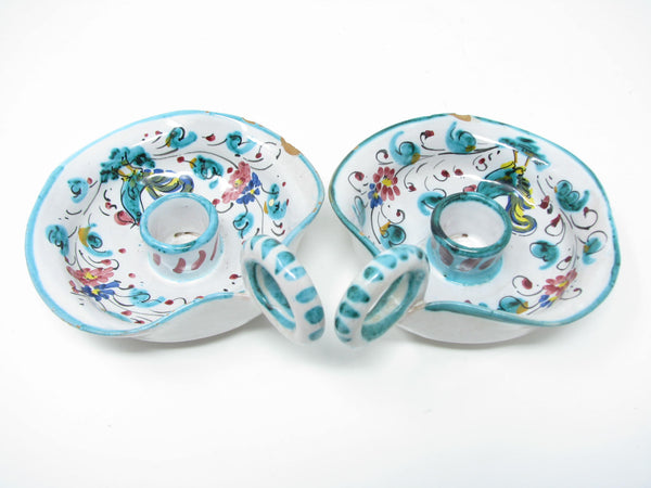 Vintage pair of Deruta (Italy) pottery candle holders with hand-painted Orvieto green rooster design and ruffled edge. Unique design.