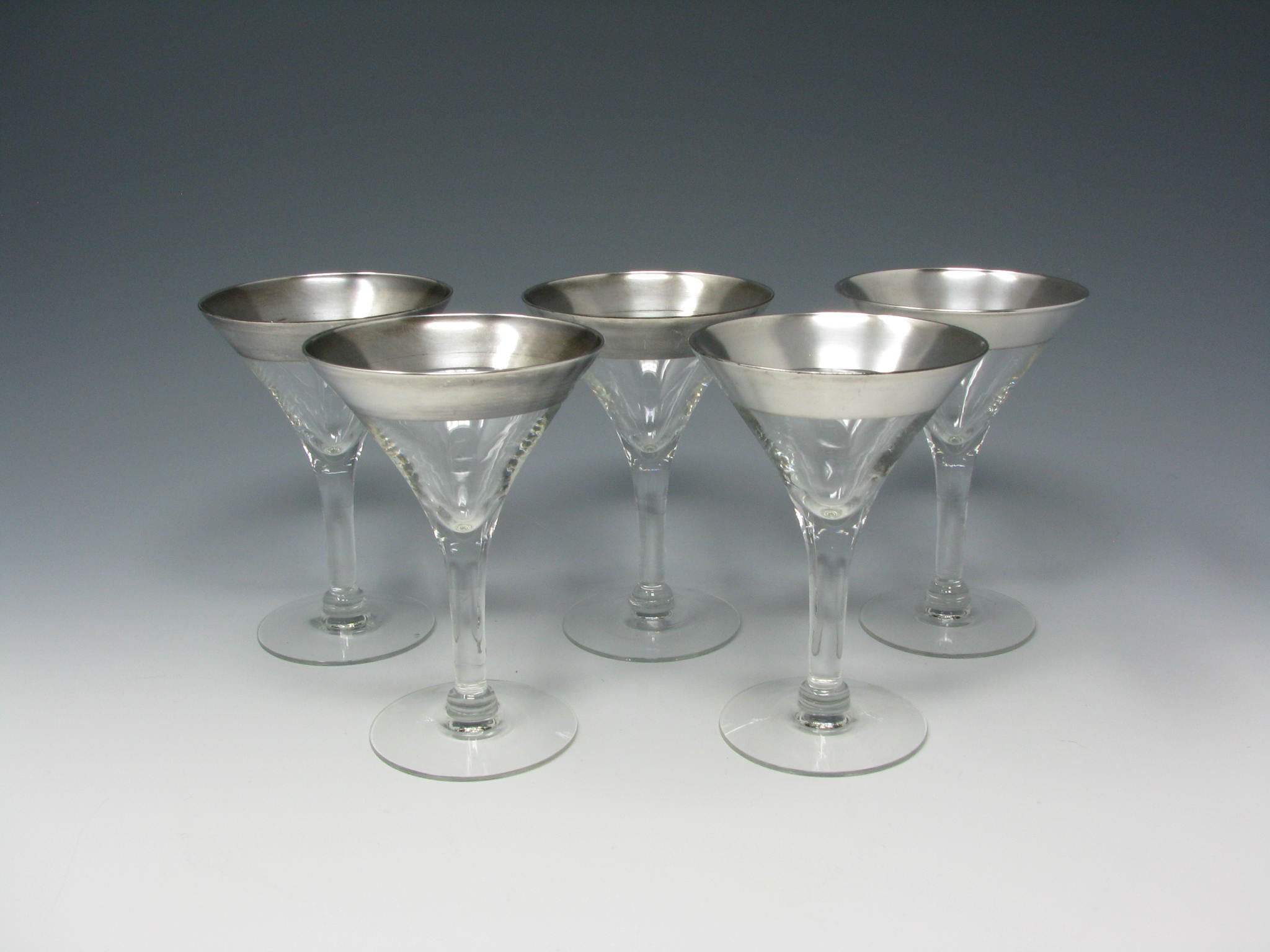 Vintage set of 5 Dorothy Thorpe flared v-shape liquor cocktail glasses with sterling silver band. Circa 1947 - 1963. Please see photos for before polishing with silver polish and after. Stunning transformation.