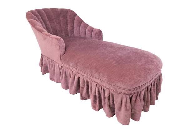 Vintage Drexel Traditional Classic Victorian style chaise lounge with scalloped back. Classic Victorian ruffle skirt covers 9" tall square tapered legs. Upholstered in a short hair muted burgundy / rose velvet.