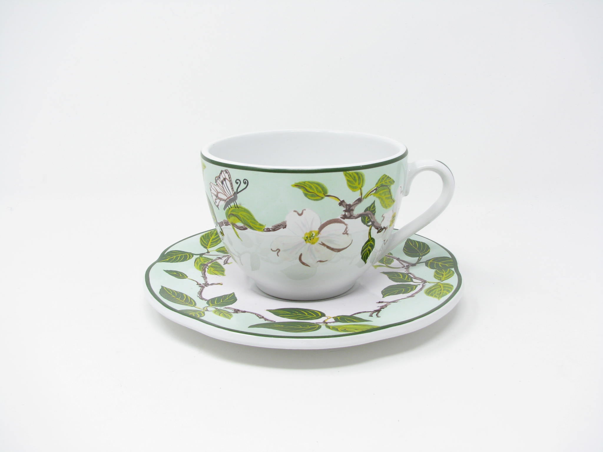 Vintage Essex Collection Robin's Nest ceramic cup and saucer with colorful butterfly design. Made in Portugal by Raul de Bernarda.