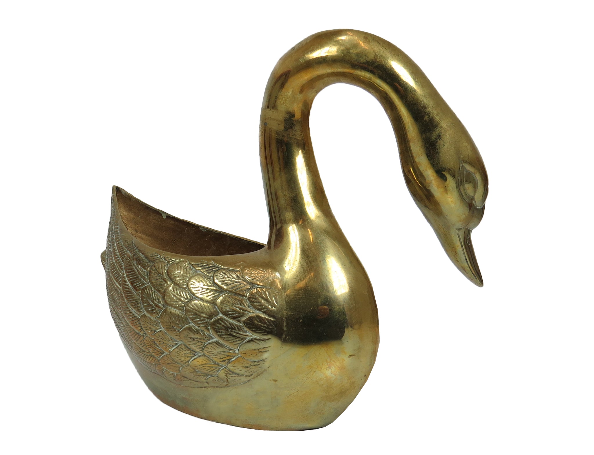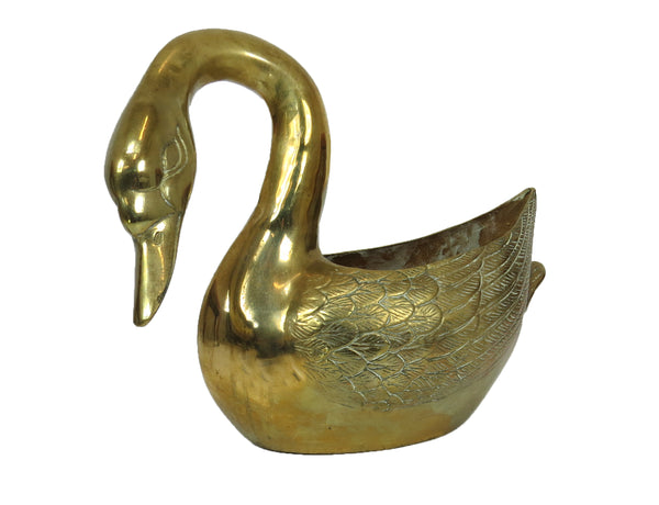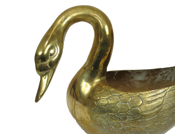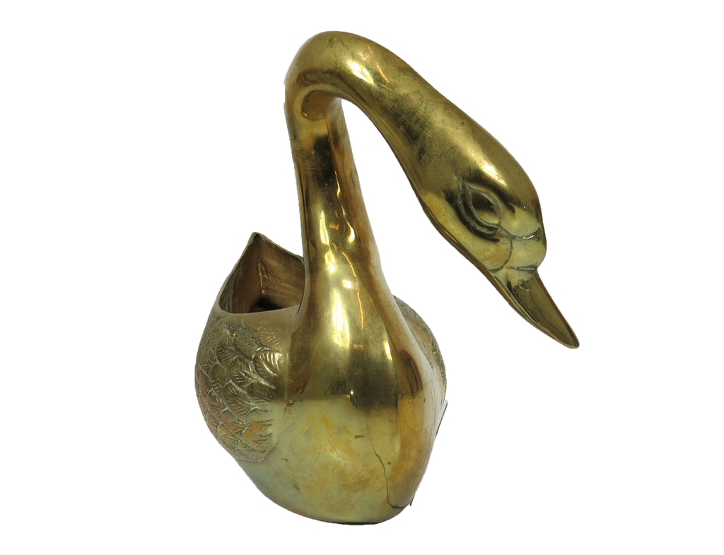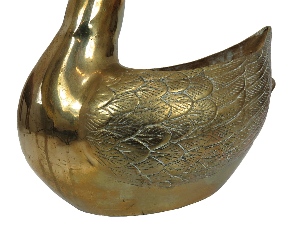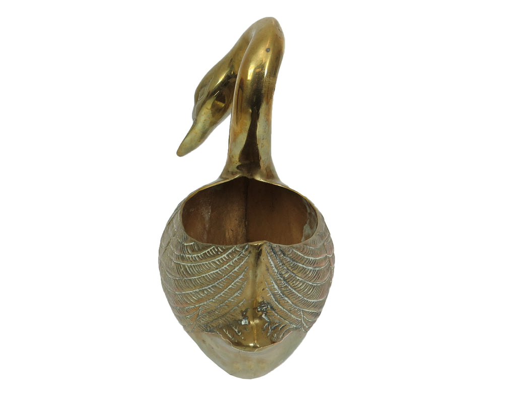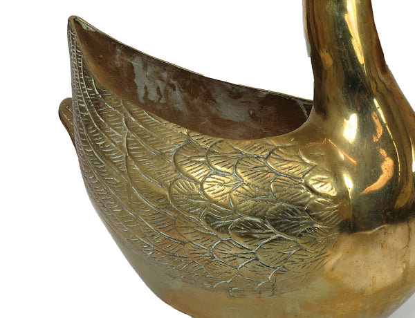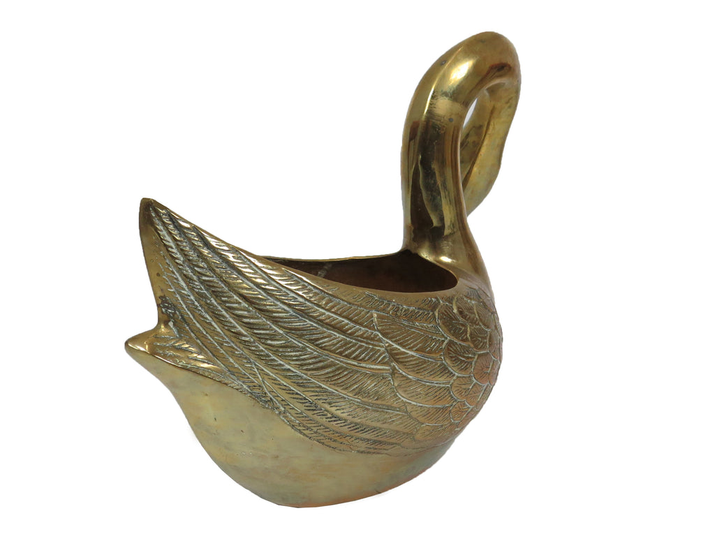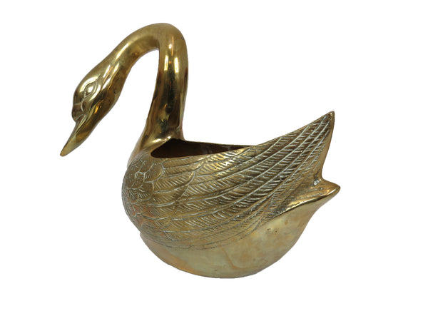 Vintage large solid brass swan planter. Good casting details to wings and face. Elegant long curved neck.