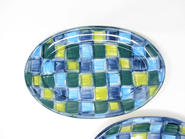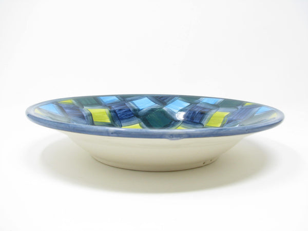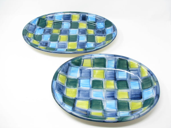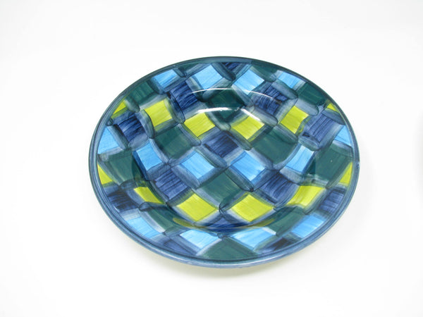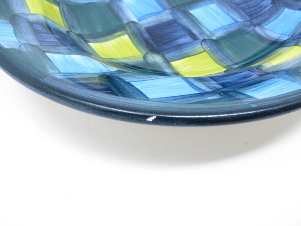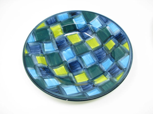 Vintage Fajans Polish ceramic serving dishes with hand-painted blue, chartreuse, green, and turquoise plaid design. This 7 piece set includes 2 platters, 1 bowl, 1 pitcher, 1 creamer, 1 lidded sugar bowl and a butter dish.