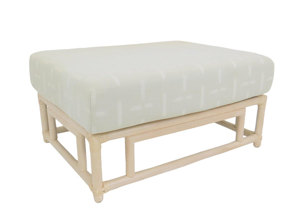 Vintage 1980's Ficks Reed faux bamboo large ottoman. Upholstered in a light sage green fabric with white accents. The 6" thick cushion makes this piece very comfortable. Made from solid hardwoods painted in ivory color.