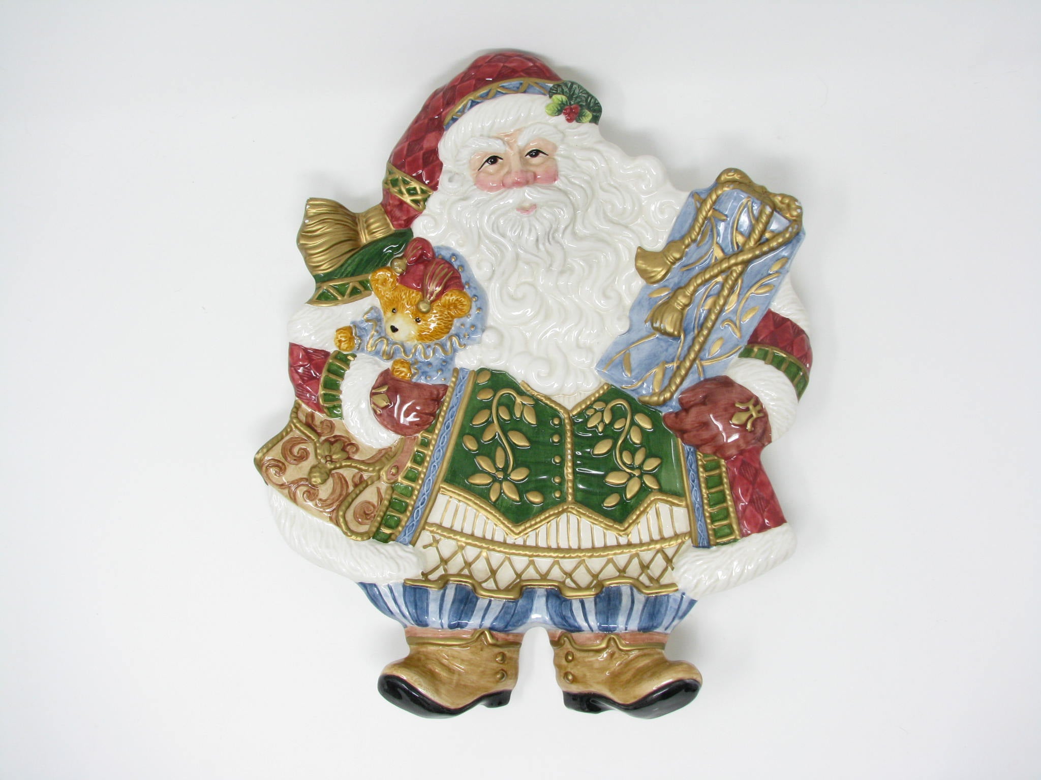Vintage Fitz & Floyd Classic Jolly Ole Saint Nick ceramic figural Santa platter with embossed details.