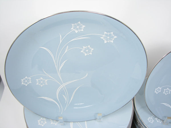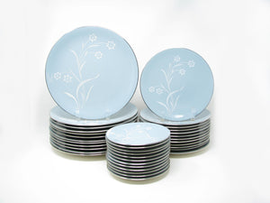 Vintage Flintridge Reverie Strata Blue coupe dinnerware set with white floral pattern and platinum trim. This beautiful 36 piece set includes 12 dinner plates, 12 salad plates, and 12 bread / dessert plates.