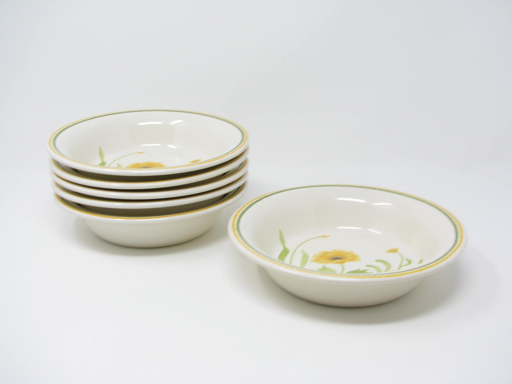 Vintage 1970s Franciscan Poppy earthenware bowls with yellow floral design. Set includes 6 bowls.