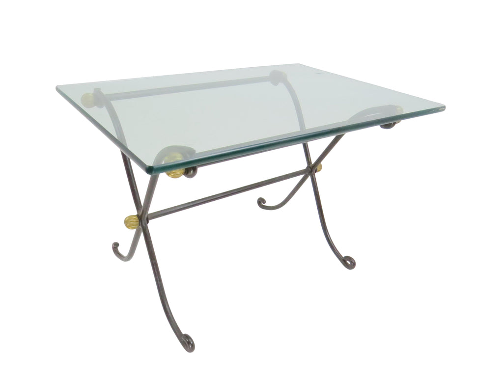 Vintage French Empire style iron and glass X-base side table. Solid iron round bar with reeded solid brass swirl accent caps.