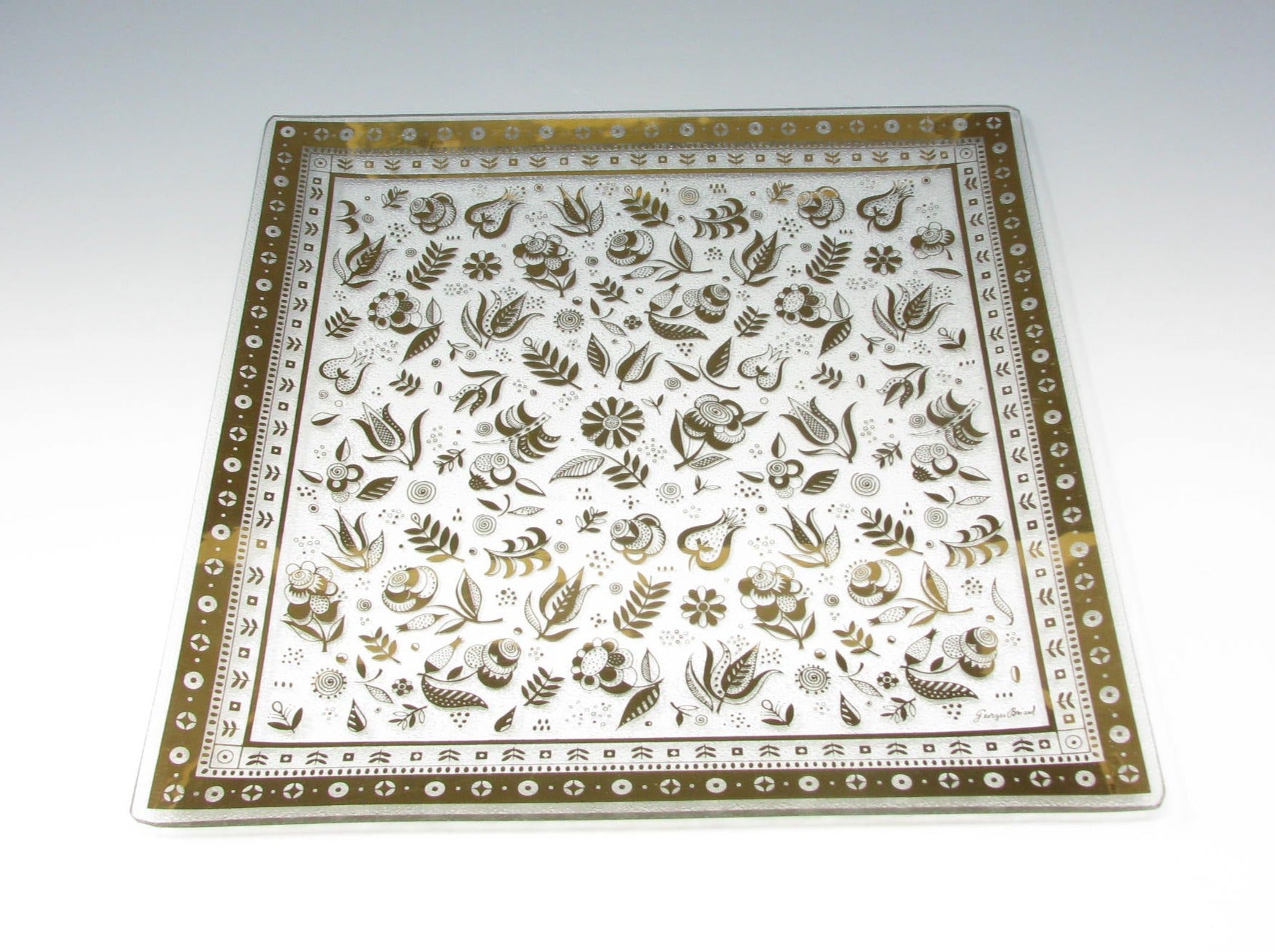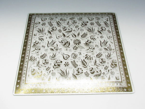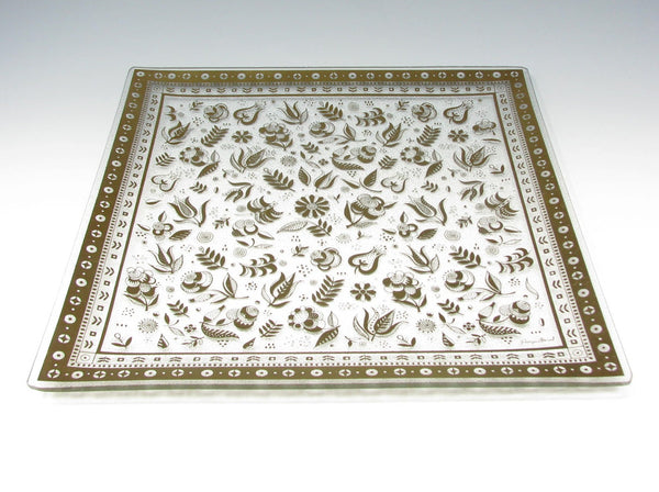 Vintage Georges Briard Persian Garden square bent glass serving tray or dish decorated with 22K gold pattern of leaves and flowers. Underside of dish has a very subtle and fine dotted texture. Lemons not included.