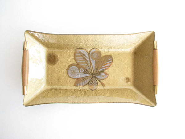 Lovely vintage Georges Briard rectangular glass serving tray with Heritance gold leaf design and wood handles. Perfect as a serving tray, decorative display, or as a valet / catchall.
