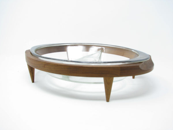 Vintage Glasbake Divided Glass Serving Dish with Walnut Footed Stand