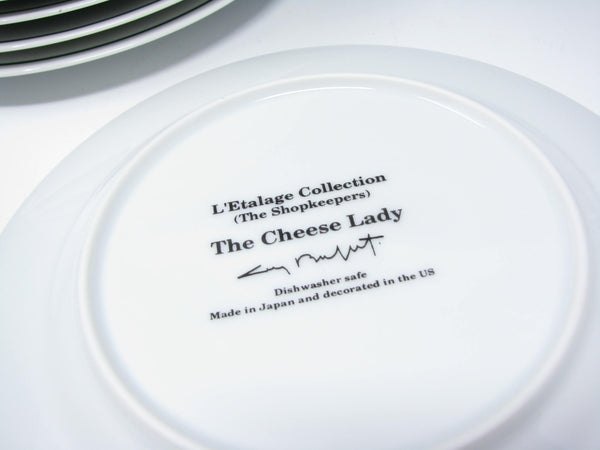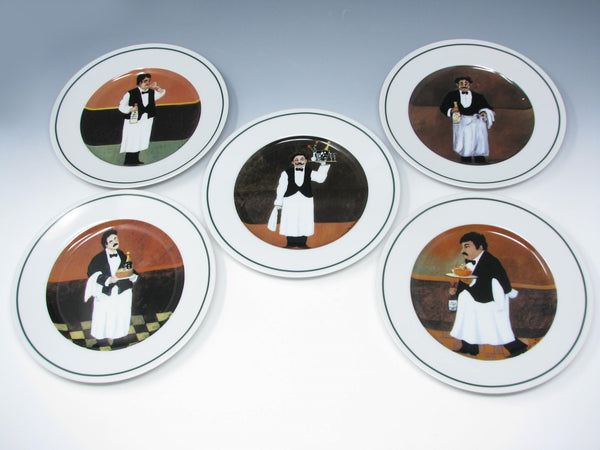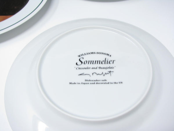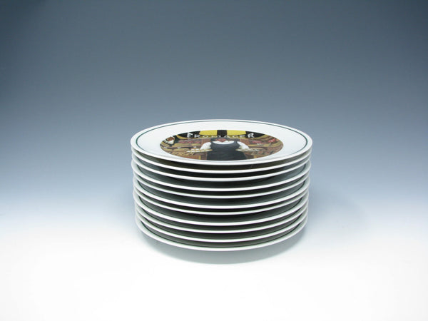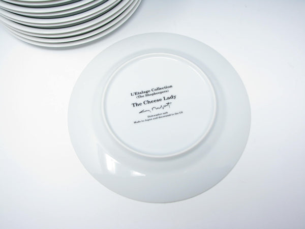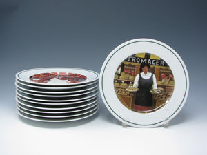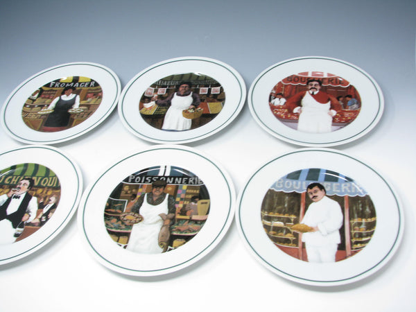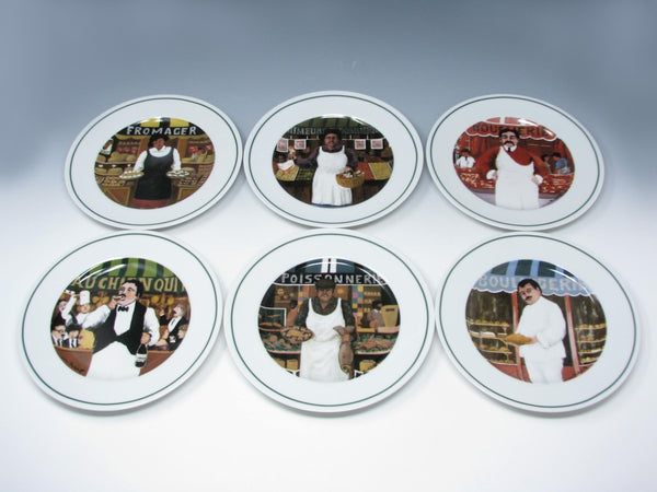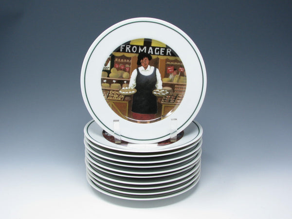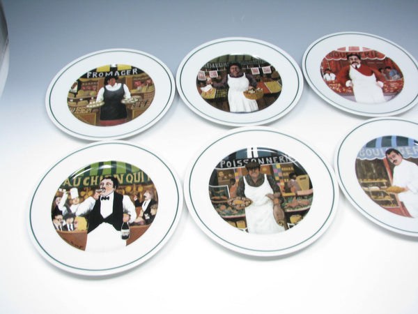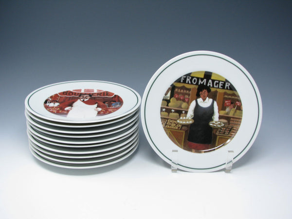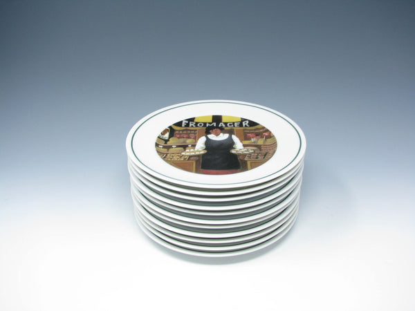 Vintage set of 11 Guy Buffet Sommelier & Shopkeepers porcelain salad plates with French inspired with each plate featuring a unique figure/design.