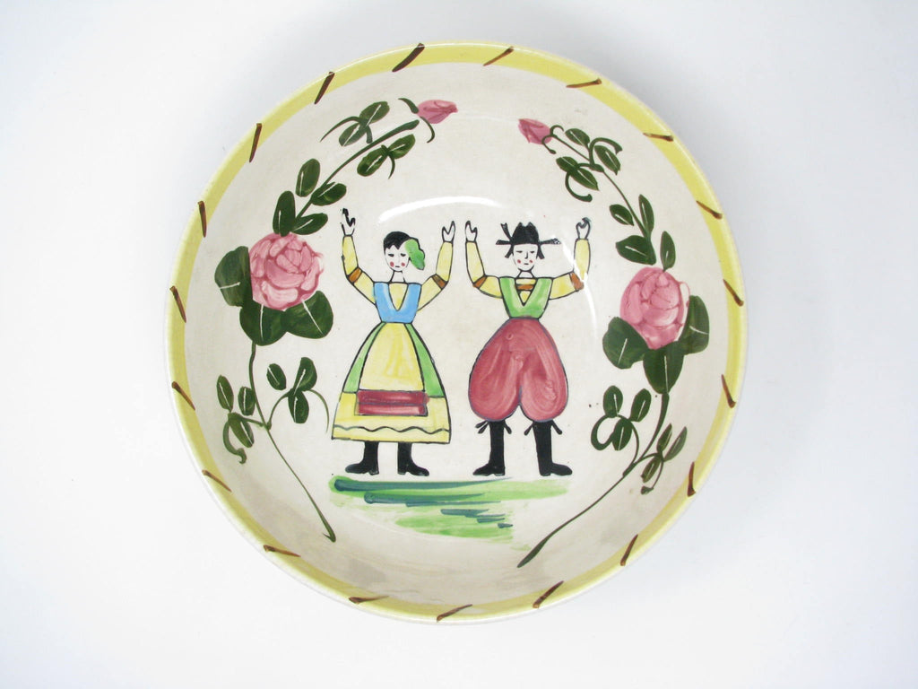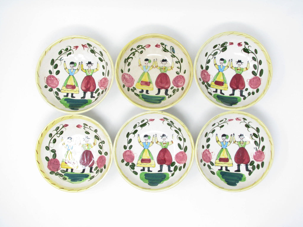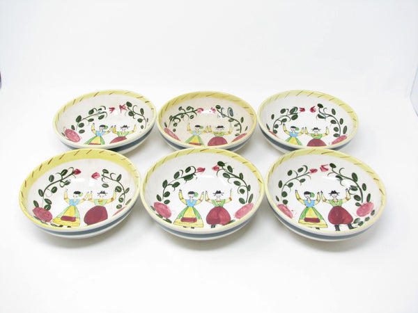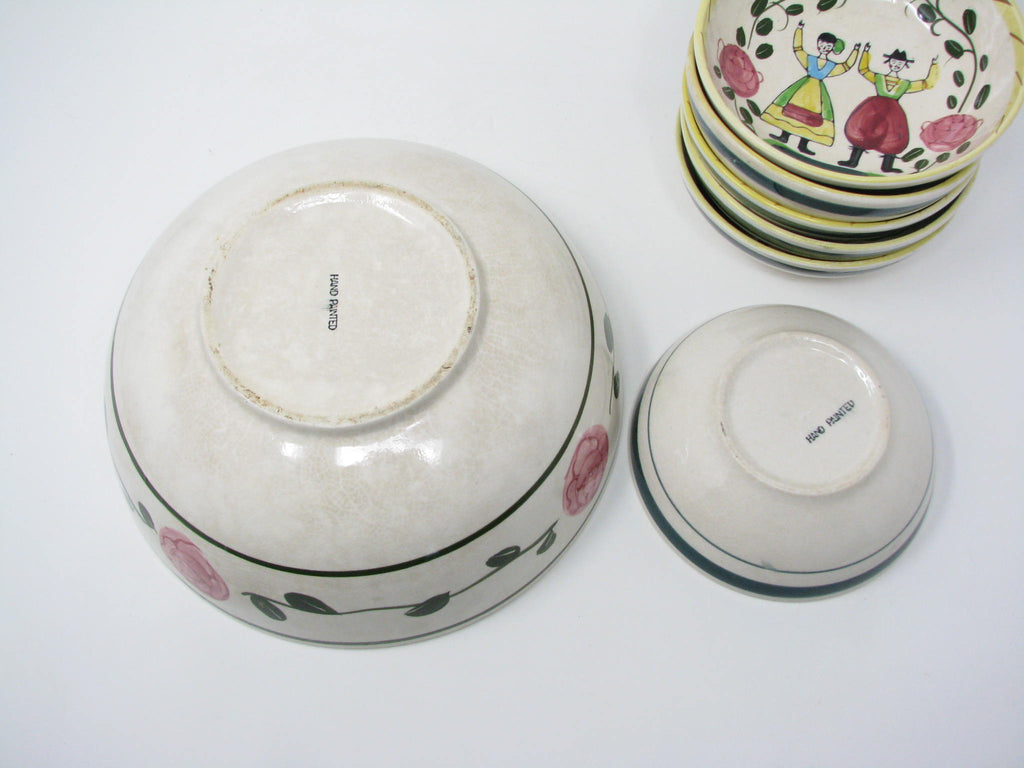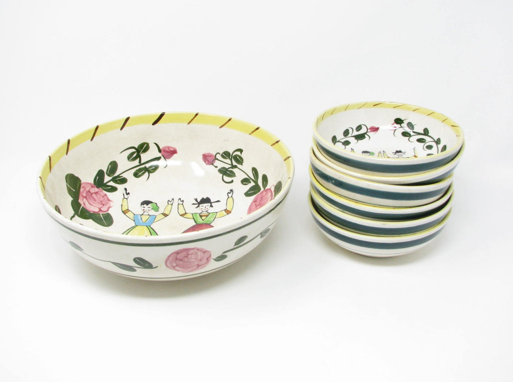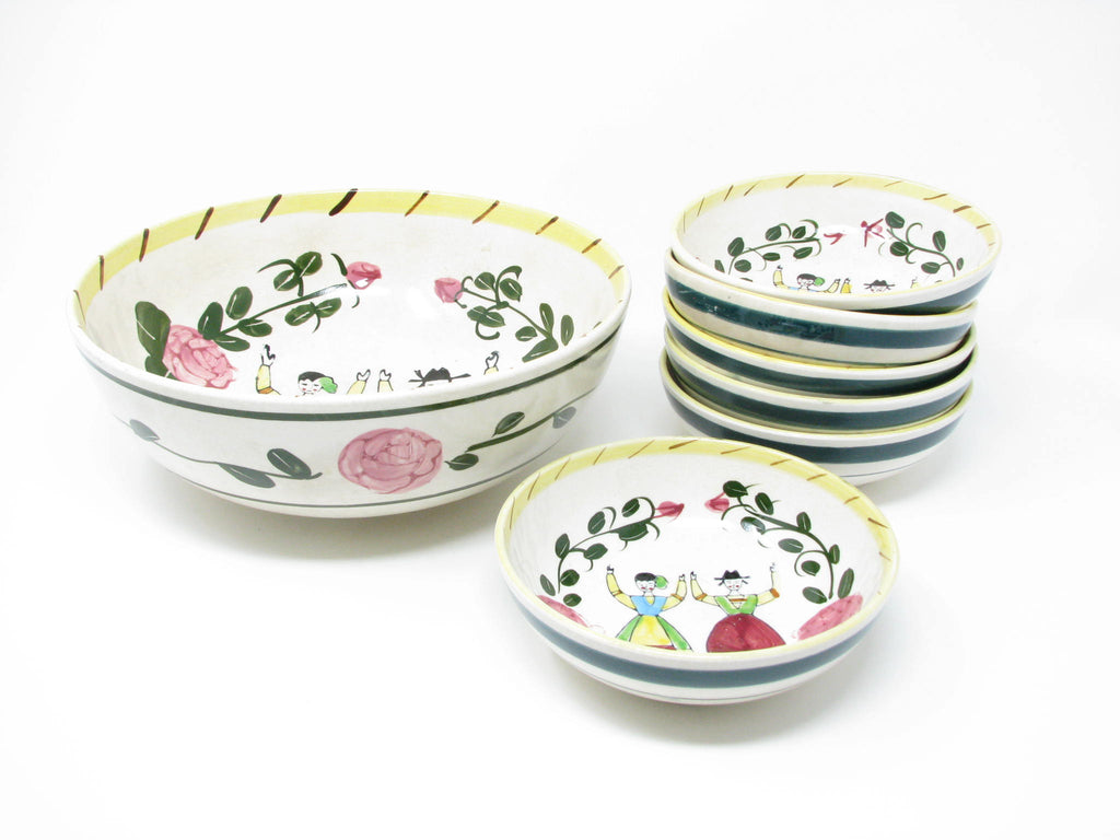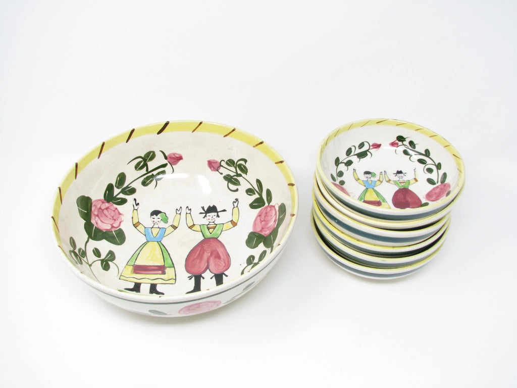 Vintage serving bowl set featuring Pennsylvania Dutch, French Country, or Scandinavian folk art style figures. Hand-painted. This 7 piece set includes 1 large serving bowl and 6 smaller bowls.