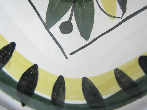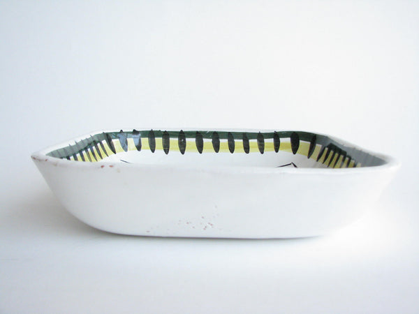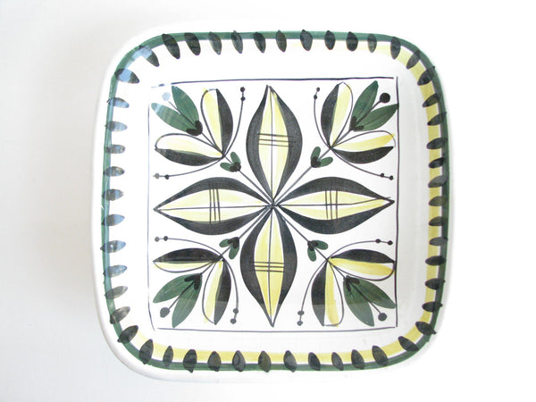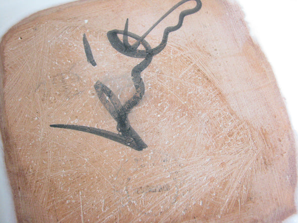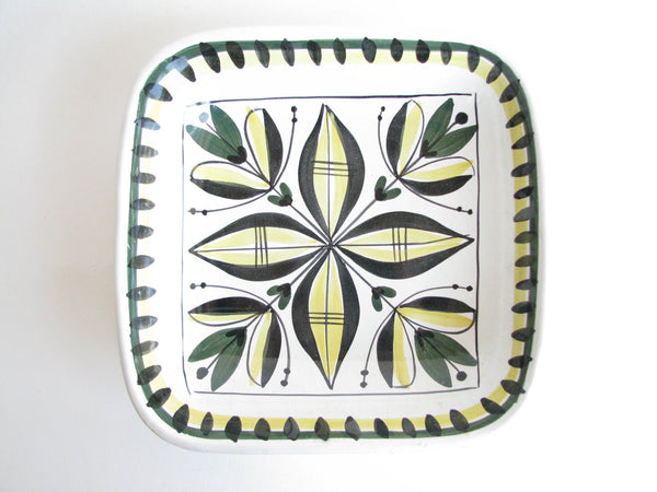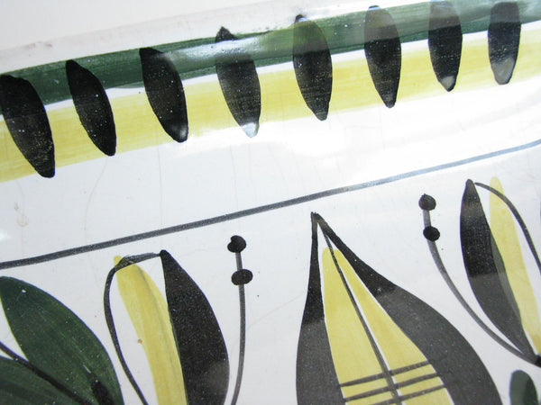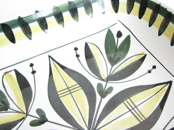 Vintage hand-painted pottery serving dish with rounded corners. Stamped on underside with artist signature.