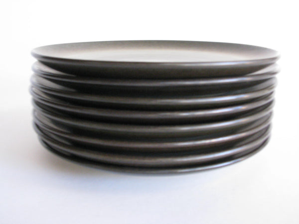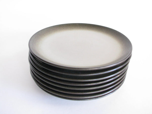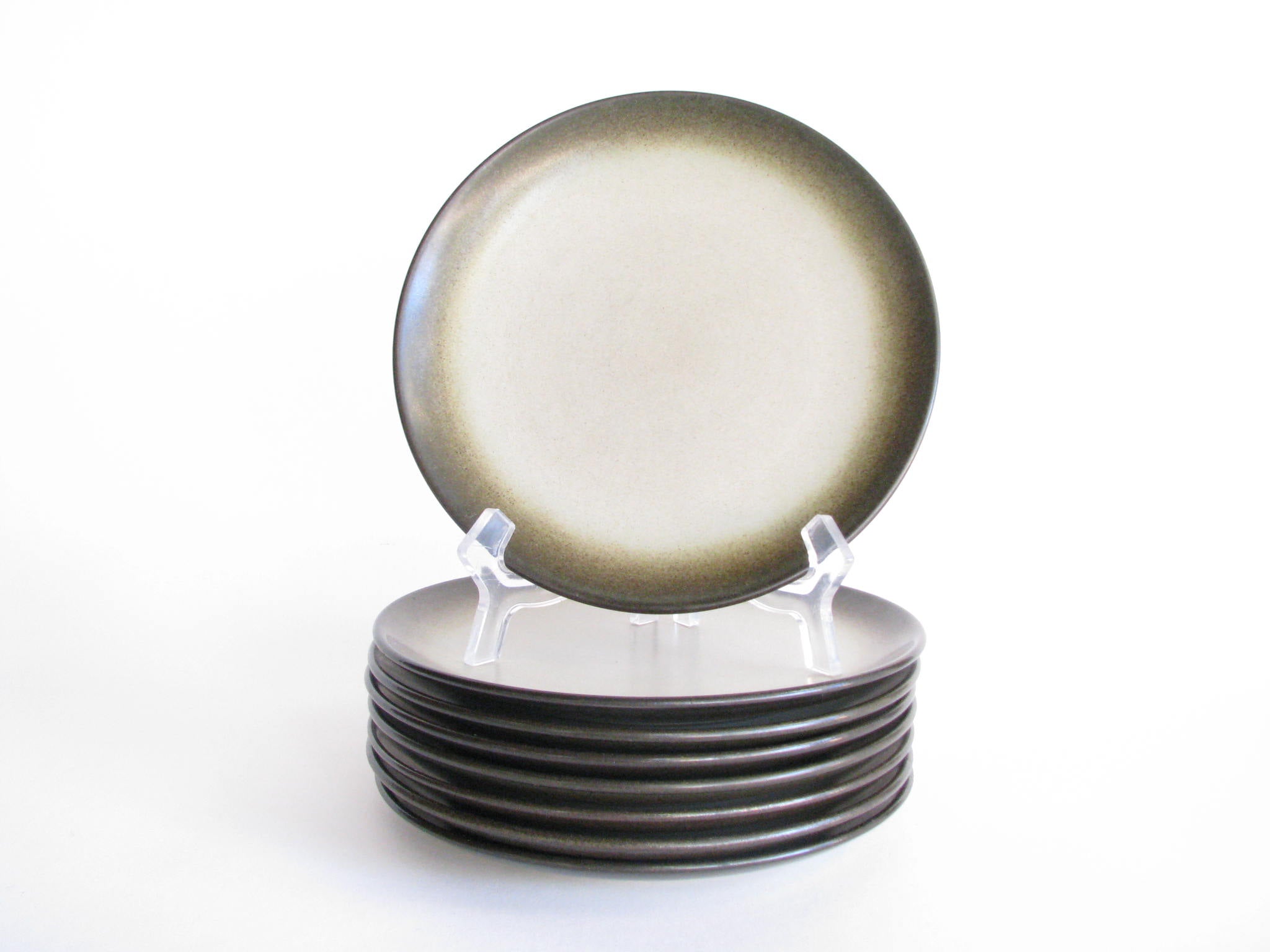 Set of 8 Heath Ceramics Sea and Sand coupe shaped salad plates. Beautiful matte finish and coloring that starts as dark green on the edge and fades to sand in the middle. Now discontinued, Sea and Sand first debuted at the San Francisco Museum of Art in Summer 1949 for the exhibition Design in the Patio.