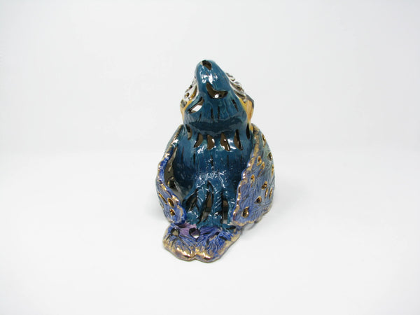 Vintage Blue Sky ClayWorks Pottery parrot candle holder by Canadian potter Heather Goldminc. Hinged door where one places a tealight.