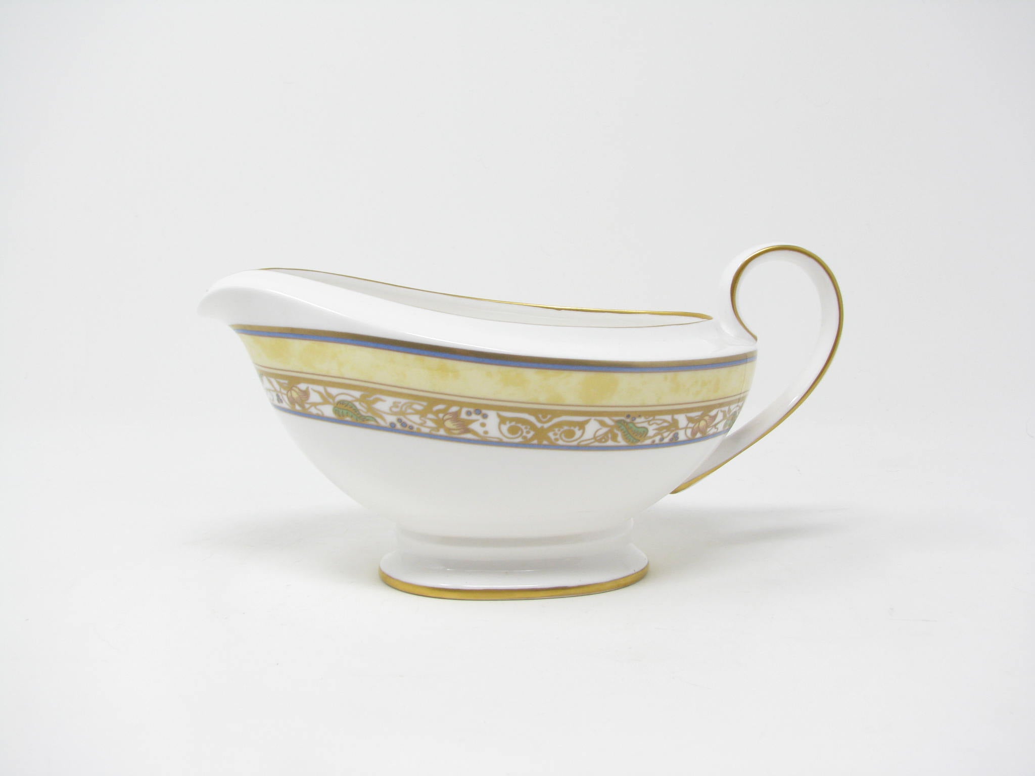 Vintage Heinrich Villeroy & Boch Villa Cannes gravy boat with thick marbled yellow band, blue trim and subtle floral decoration.