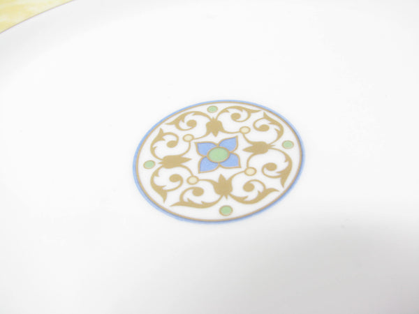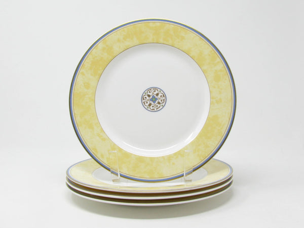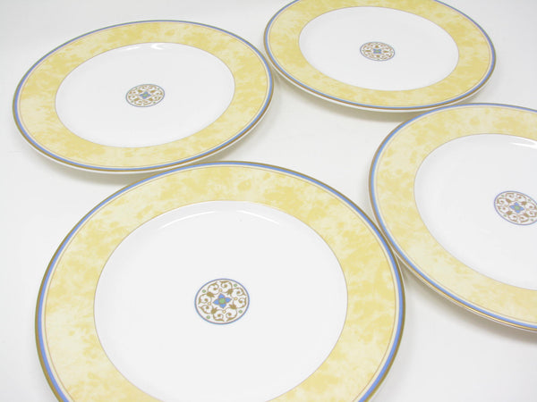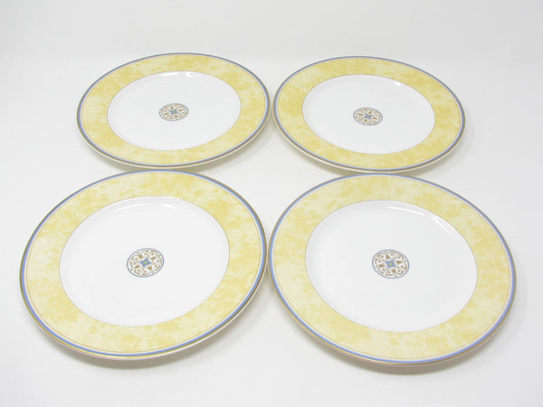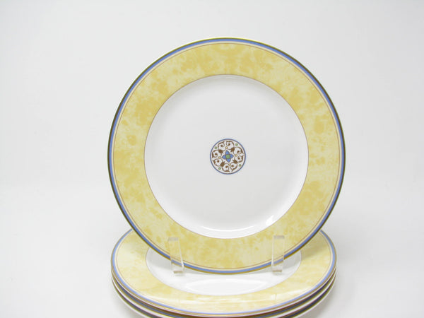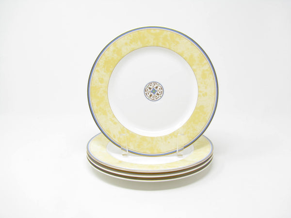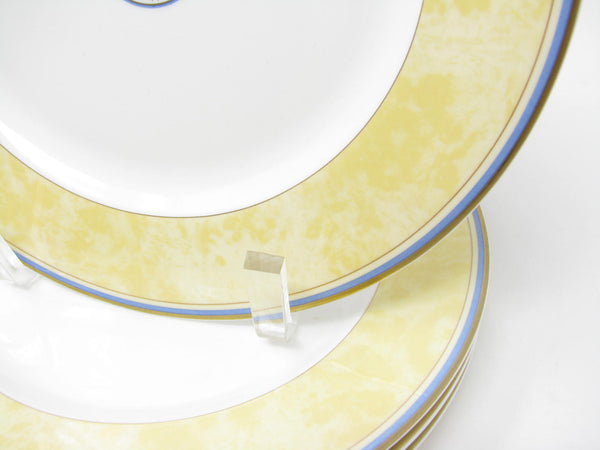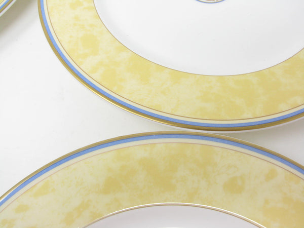 Vintage Heinrich Villeroy & Boch Villa Cannes bone china salad plates with thick marbled yellow band, blue trim and center medallion decoration. Set includes 4 salad plates.