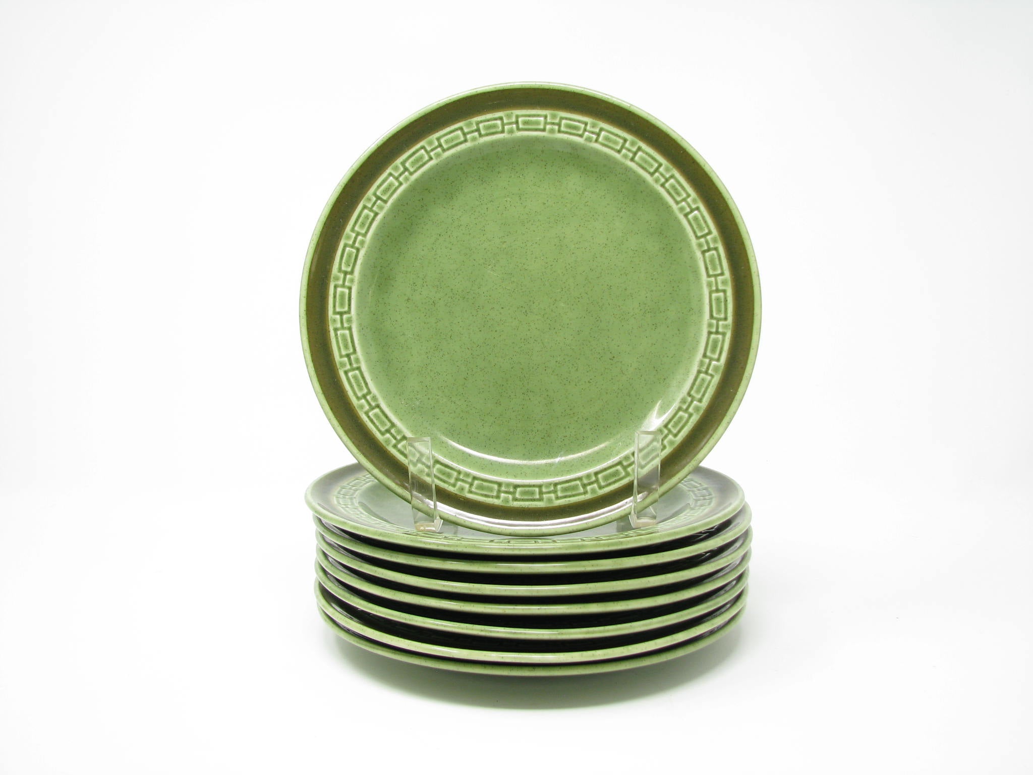 Vintage set of 8 International Verde green stoneware salad plates with geometric rim.