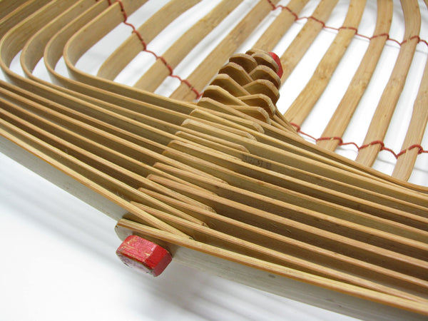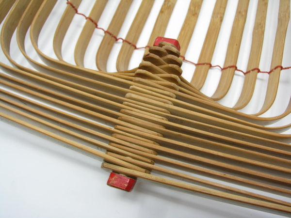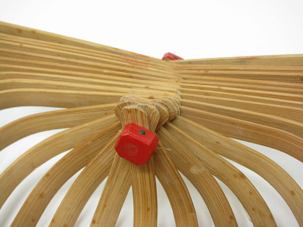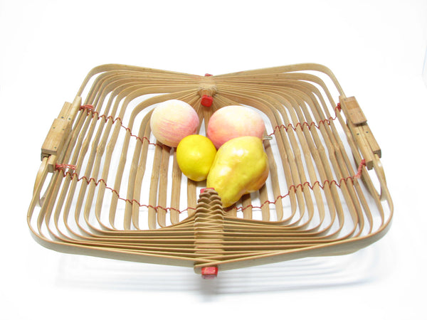 Vintage 1940's-1950's Japanese bamboo folding purse, handbag or basket. Interlocking closure and curved handles. Fantastic design. Stamped "Japan". Faux fruit not included.
