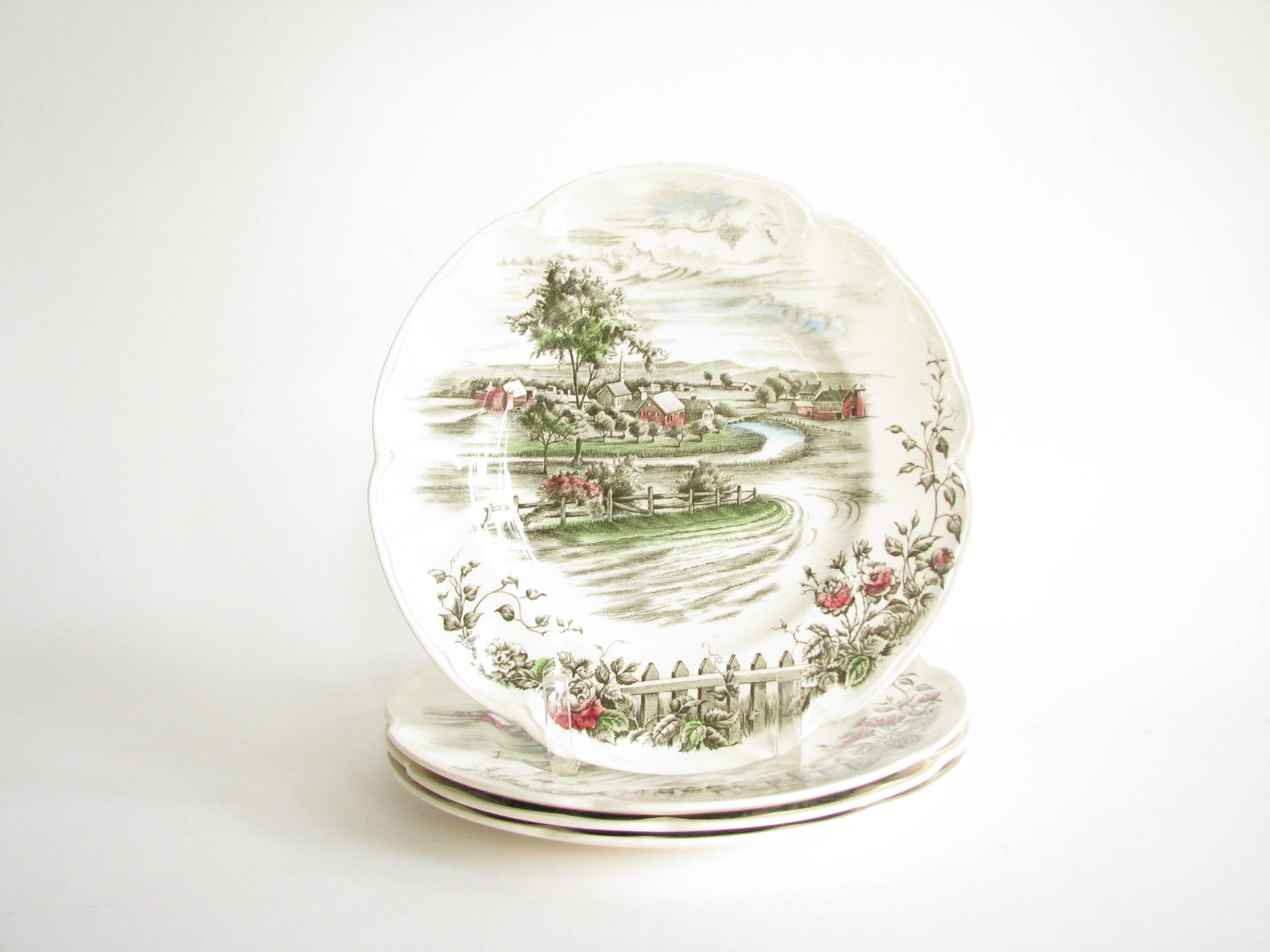 Vintage set of 4 Johnson Brothers The Road Home scalloped ironstone dinner plates with countryside / country village design.