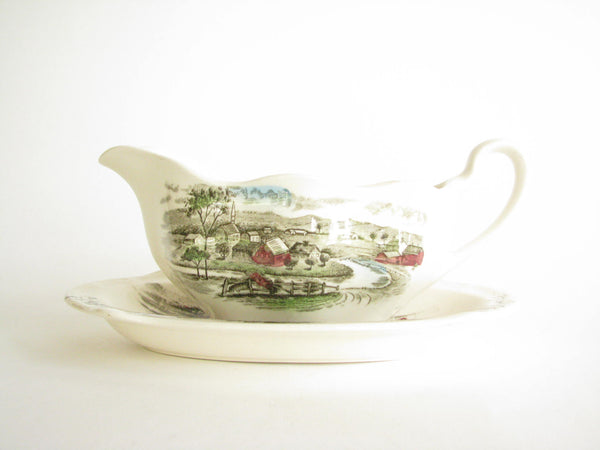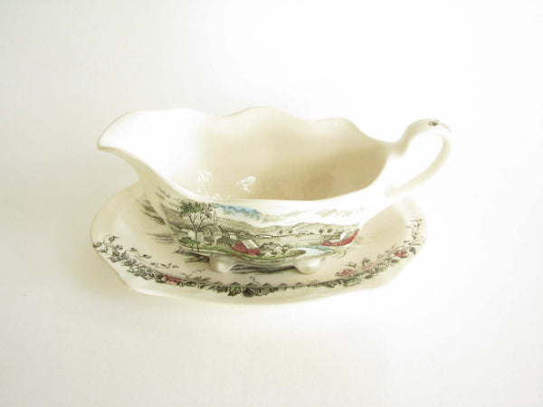 Vintage Johnson Brothers The Road Home ironstone gravy boat and detached underplate with countryside / country village design.