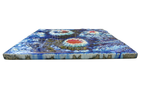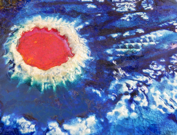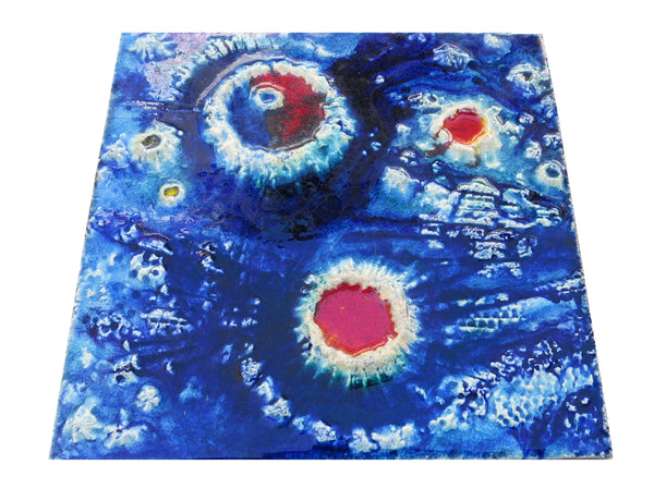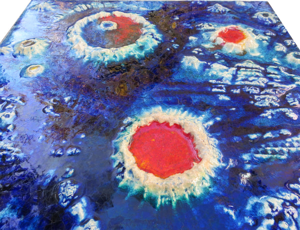 Vintage large ceramic decorative tile / wall decor by Karl-Heinz Feisst for Karlsruhe Majolika. Fantastic textured crater form and vibrant glaze. Karlsruhe marks on verso.