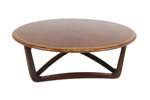 Mid-century modern round coffee table by Lane Furniture Co. Features a sculpted base in solid walnut. The top has beautiful grained walnut with a light finish edge banding.