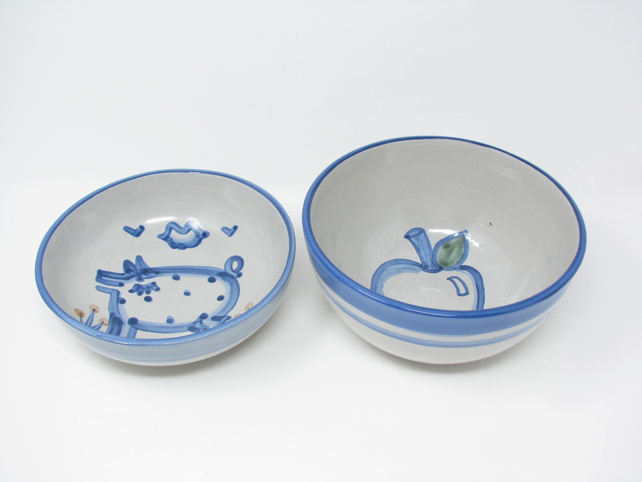 Vintage set of 2 MA Hadley Pottery Country serving bowls with hand-painted pig and apple designs.