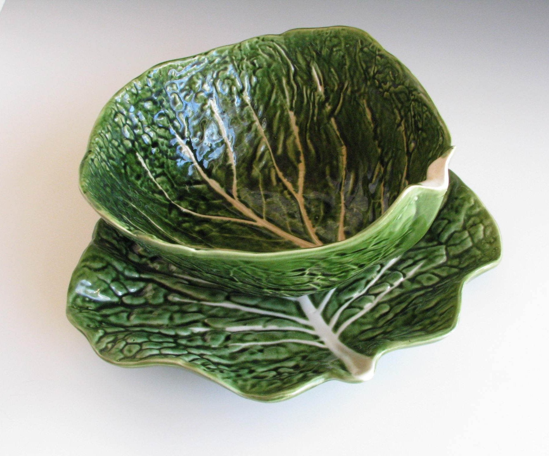 Vintage majolica cabbage leaf bowl and platter made in Portugal. Both pieces were made in the shape of a leaf of cabbage and finished with a white and dark green glaze. Marked to the underside.