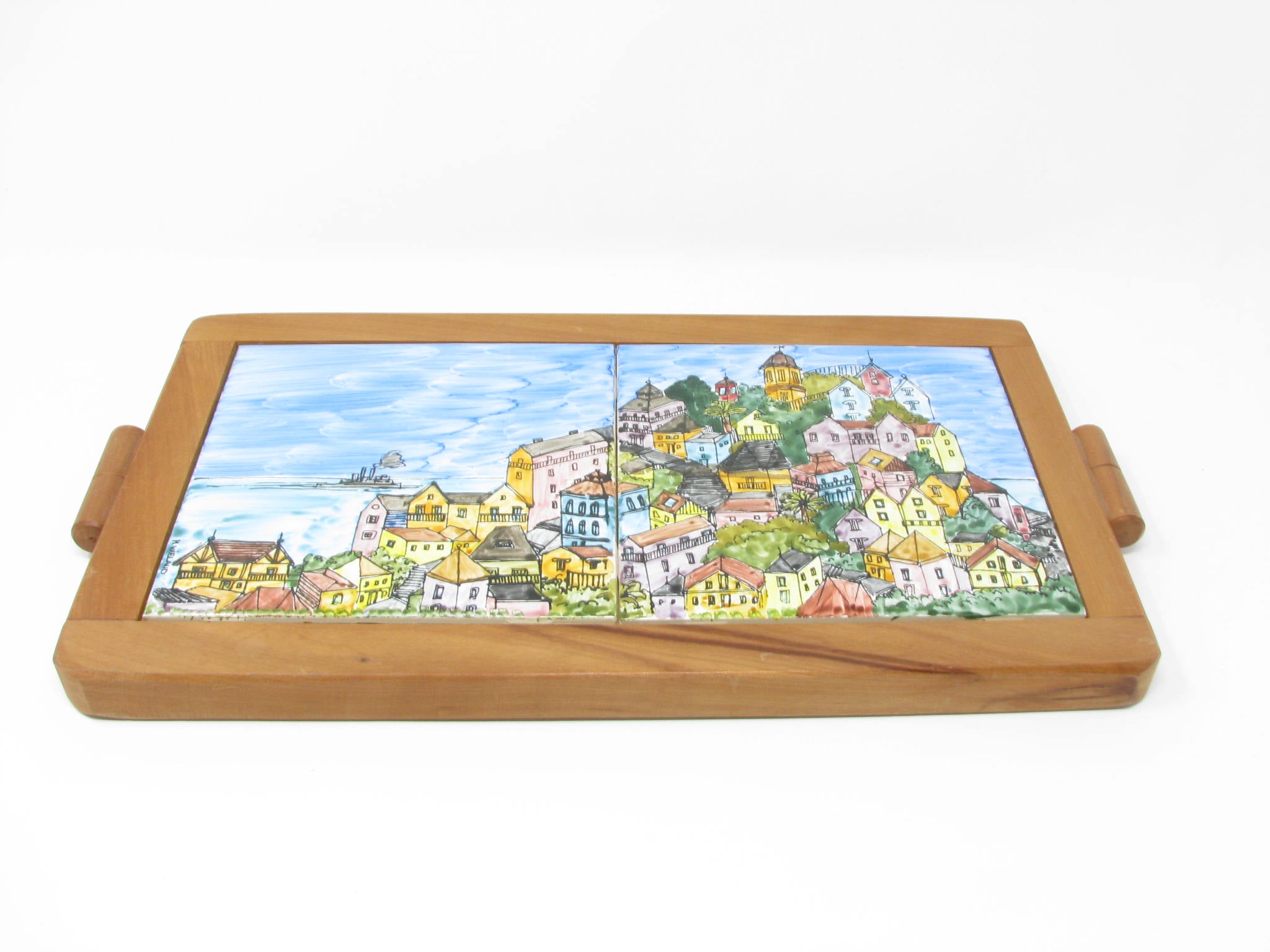 Vintage wood tray with hand-painted tiles by Chilean artist Mariana Wieland. The tile features a coastal town, possibly Valparaíso (port city on Chile’s coast, which is known for its steep funiculars and colorful, clifftop homes).