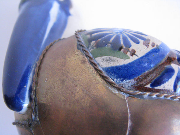 Vintage hand-painted Mexican Tonala style pottery pelican with copper details.