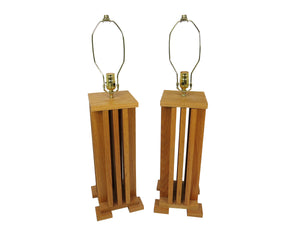 A pair of mid 20th century wire brass and glass table lamps. Each individual glass panel is beveled with simple cross-hatch / starburst etching. Each lamp holds two standard bulbs.