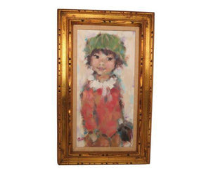 Oil on canvas of a sweet young girl with big eyes in mid-century impressionist style in gilded frame. Painted in the 1960s by M. Maleter. Maleter is a well listed artist known for paintings of children. Born in Spain in 1925 and studied in both Paris and Naples.