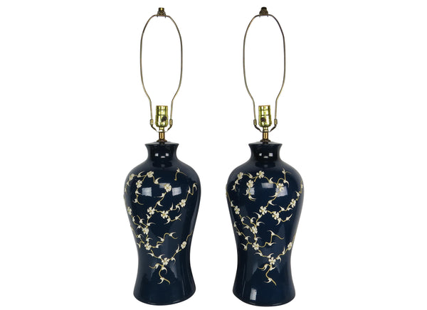 Stunning deep blue Japanese moriage lamps from the mid 20th Century. Featuring raised white cherry blossom overlay. Harps and finials are included.