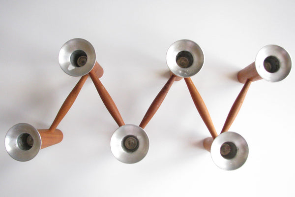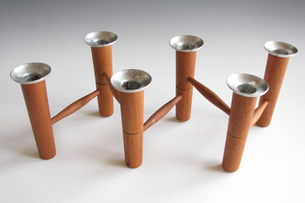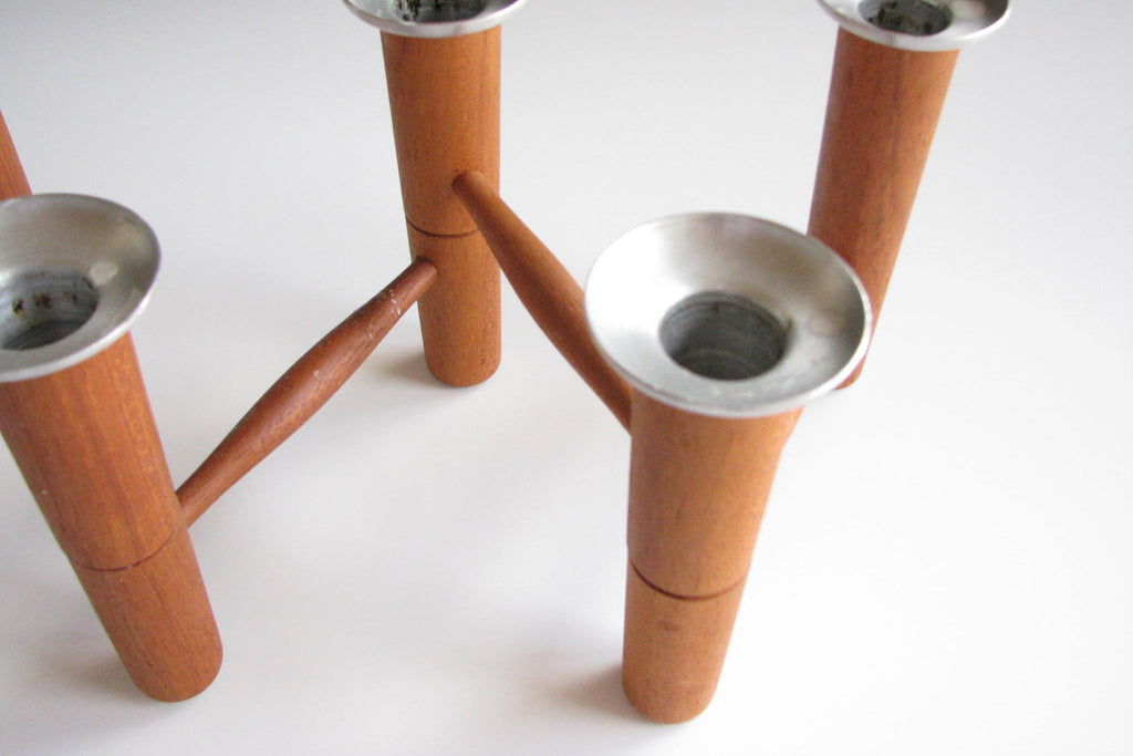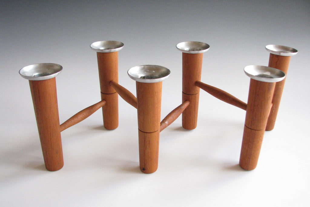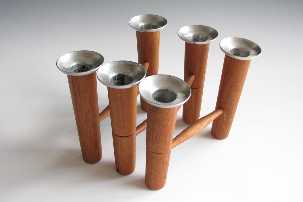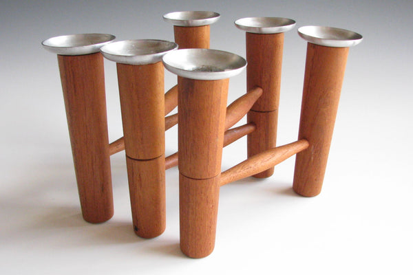 Solid teak articulating / folding 6-candle candelabra with aluminum bobeches by Laur Jensen. A very well made and artful Danish modern piece. Maker's mark imprint on underside. This piece measures 26" when fully extended.