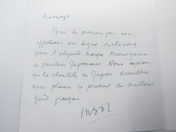 Note inside translates to "For the first time we made an exclusive line for the elegant Momoyama brand of Japanese porcelain. We inspire that the clientele in Japan will welcome with pleasure this product of the best French taste."