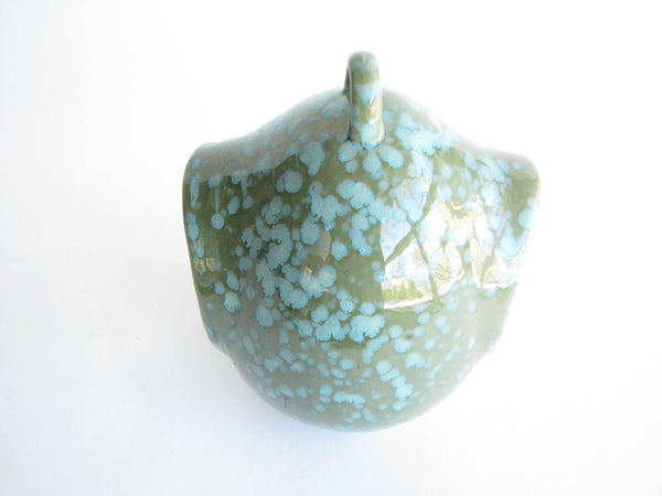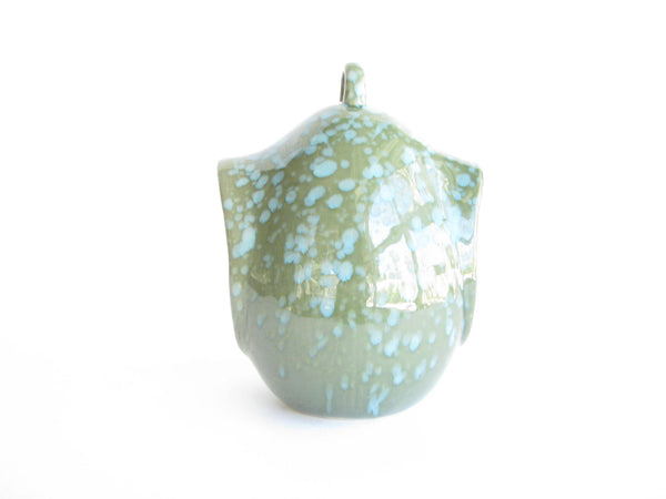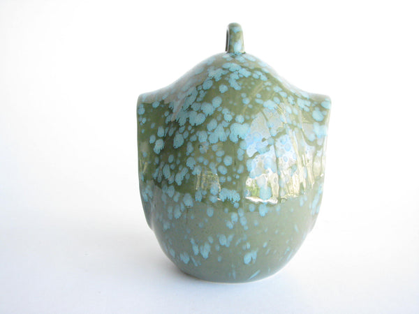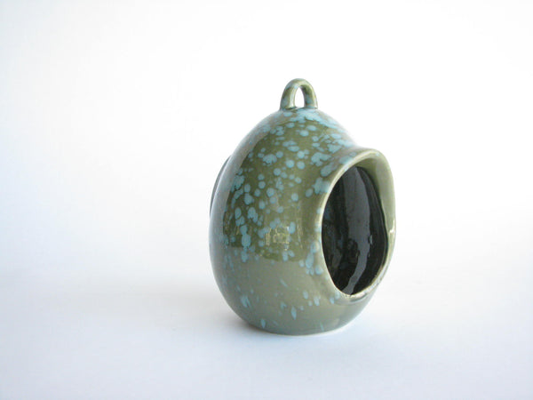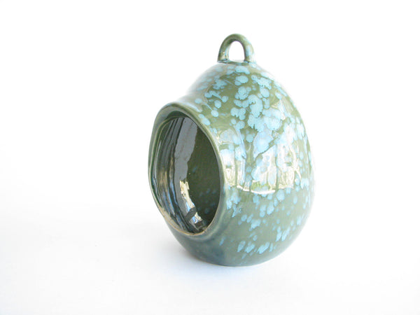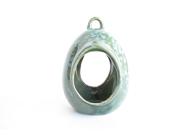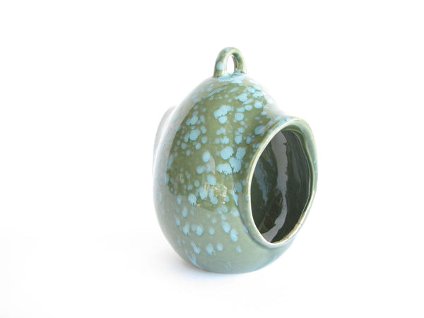 Vintage glazed ceramic hanging planter with mottled green design. Planter opens from each side. May also be used as a hanging bird feeder.