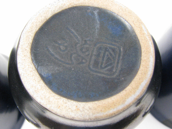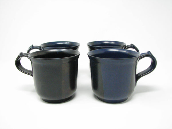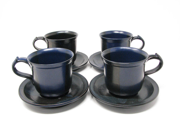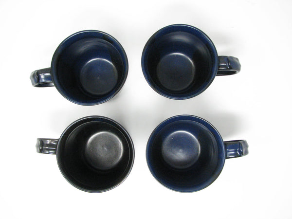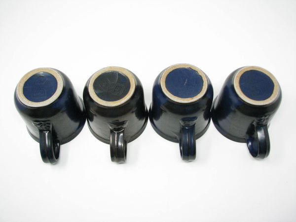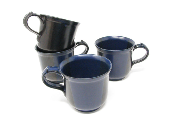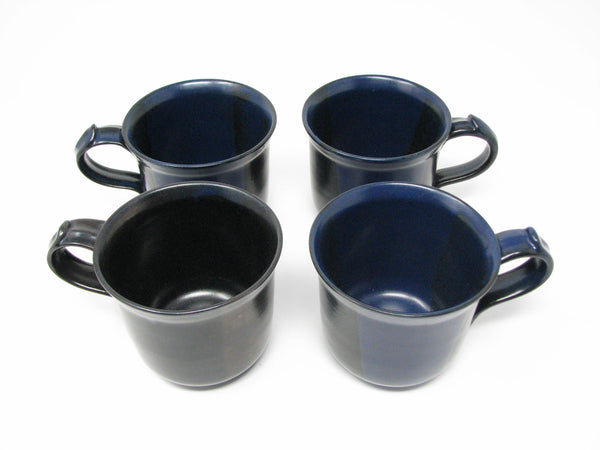 Vintage Iron Mountain Stoneware Blue Ridge mugs and saucers with black and blue design by Nancy Patterson. These mugs and saucers were hand-thrown and hand-dipped. They are heavy and substantial. Stamped on underside with Iron Mountain and Nancy Patterson marks. There are 4 mugs and 4 saucers included.
