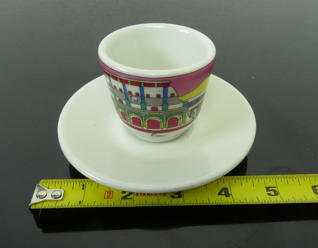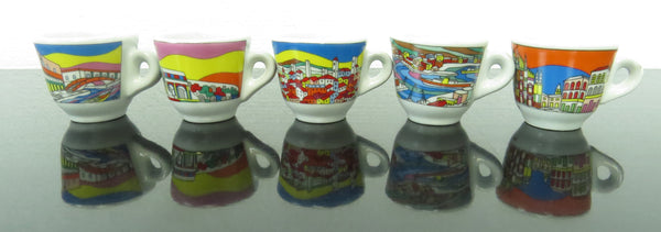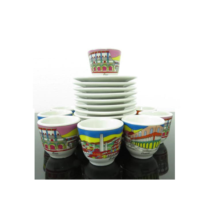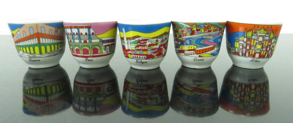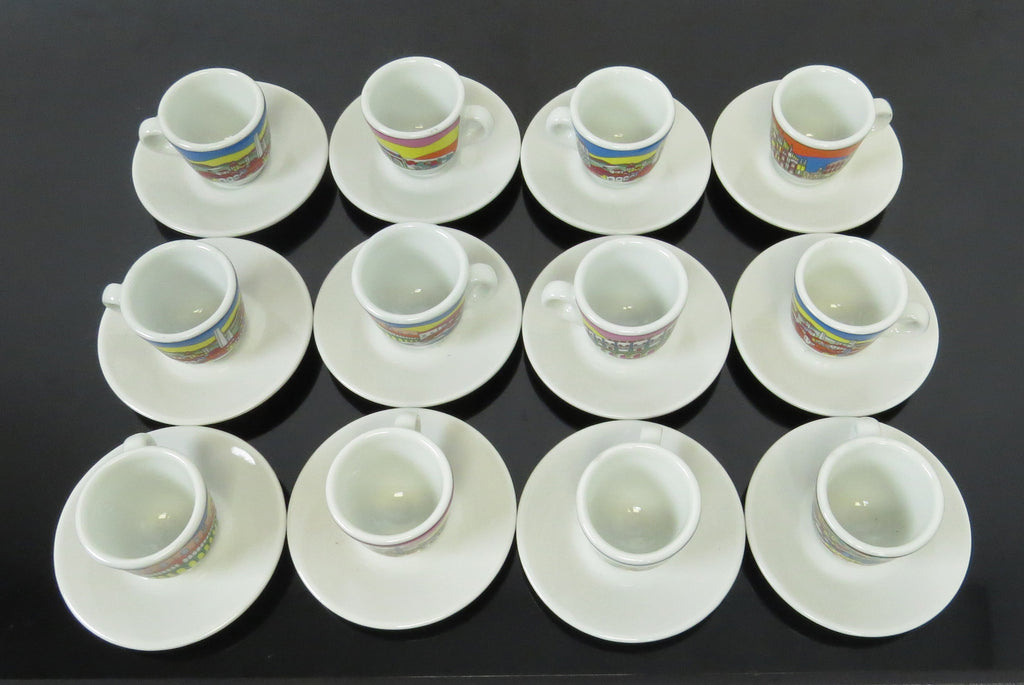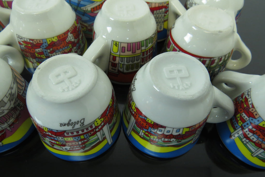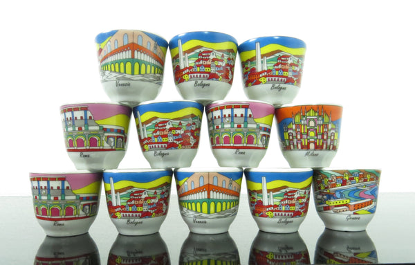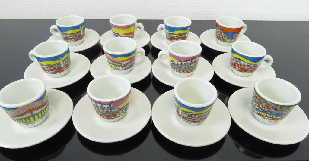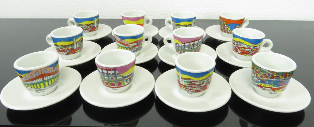 Set of 12 Nuova Point Italy porcelain demitasse espresso cups and saucers featuring cities in Italy. Cups are 2 oz. capacity. Set includes the following city scenes: 5 Bologna, 3 Roma, 2 Venezia, 1 Milano and 1 Genova.