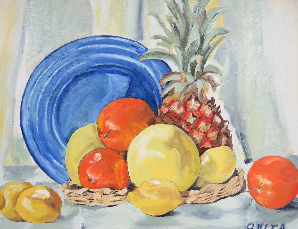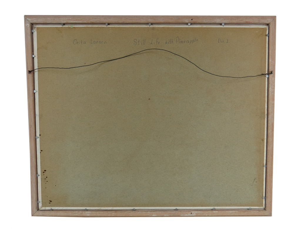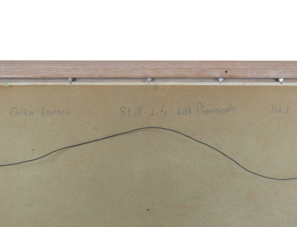 Vintage oil on mason board titled "Still Life With Pineapple" by artist Orita Larson (1913-1974). Orita was an artist and teacher from Winnebago County, Illinois. We acquired a large collection of her work which ranges from portraits to Impressionist still lifes. Her work features vibrant colors and a variety of relatable, every day scenes, evoking emotion in even the most mundane things/activities.