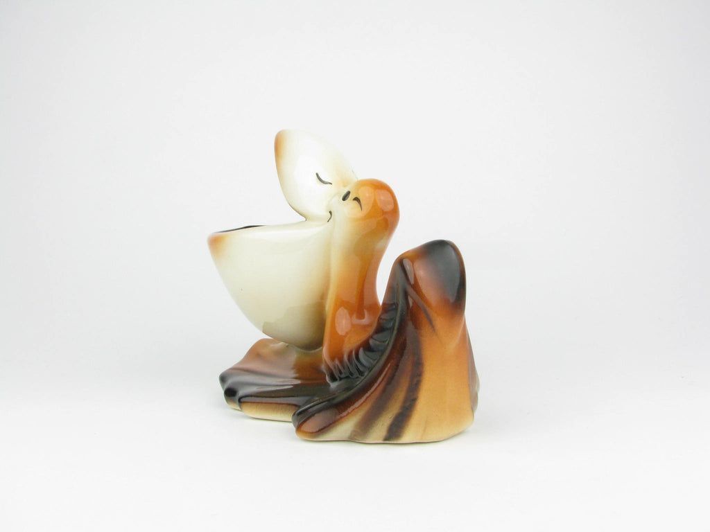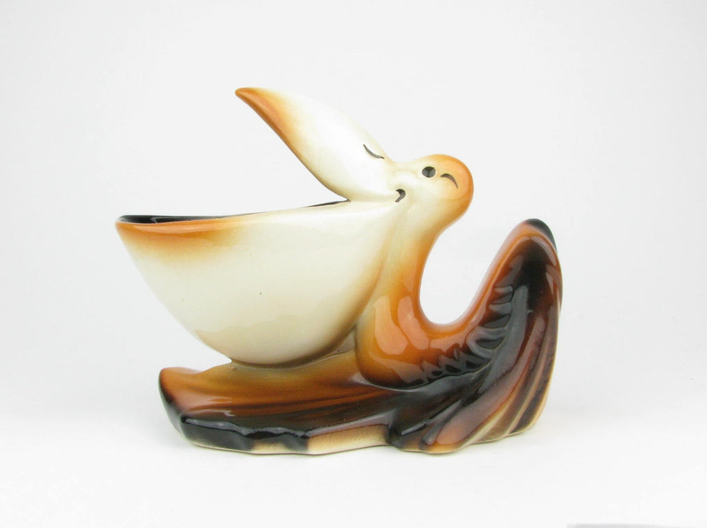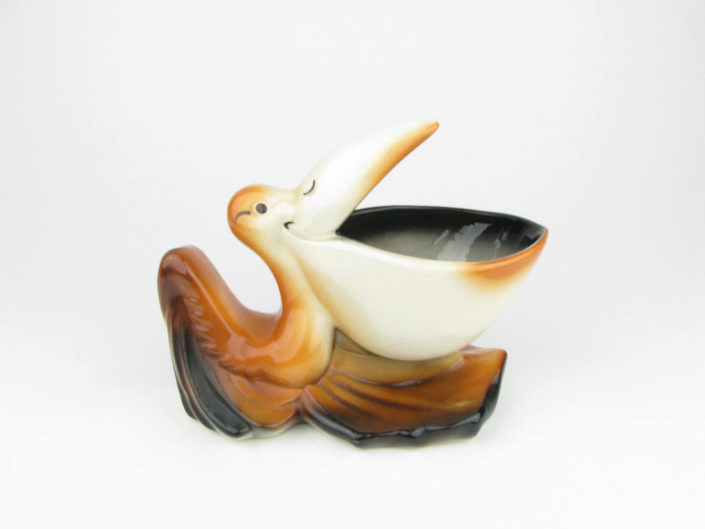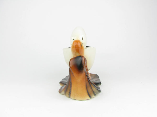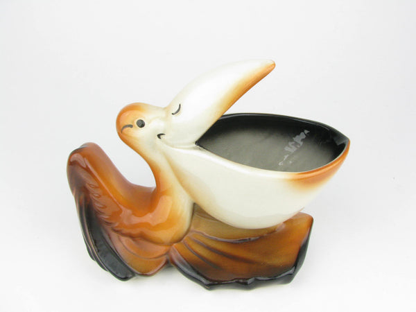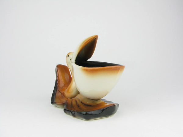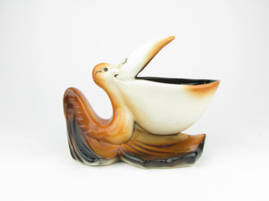 Vintage small ceramic planter shaped like a pelican with an open beak.