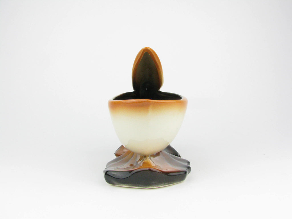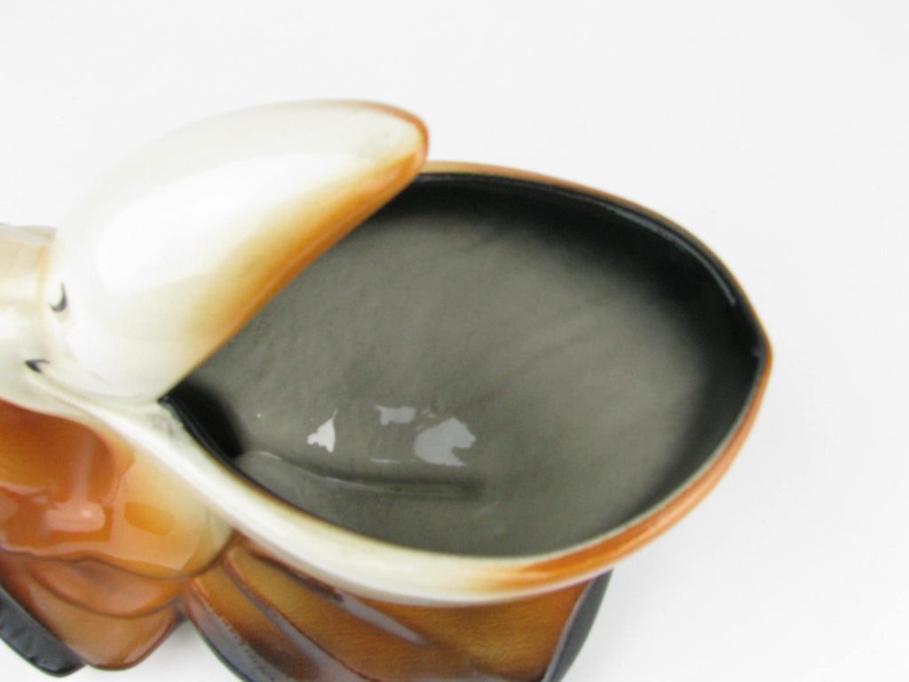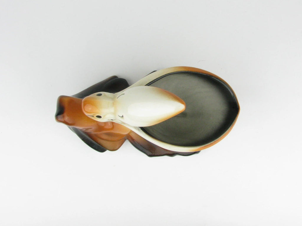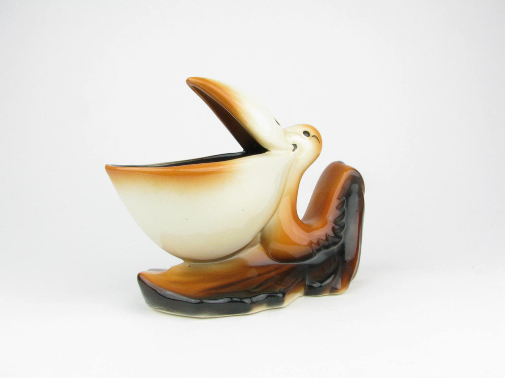 Vintage small ceramic planter shaped like a pelican with an open beak.