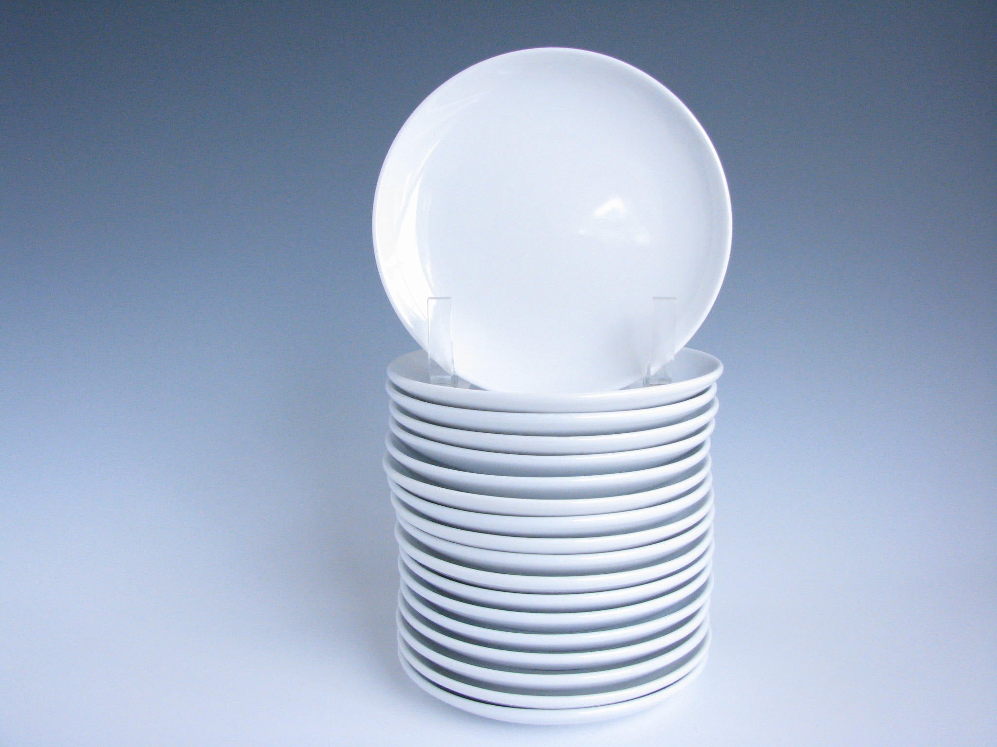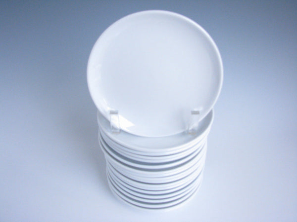 Vintage set of 18 white coupe bread or appetizer plates by Rego. Beautiful shape and very bright white. Appears to have never been used. Marked 'Rego Continental #8-1586' on underside.